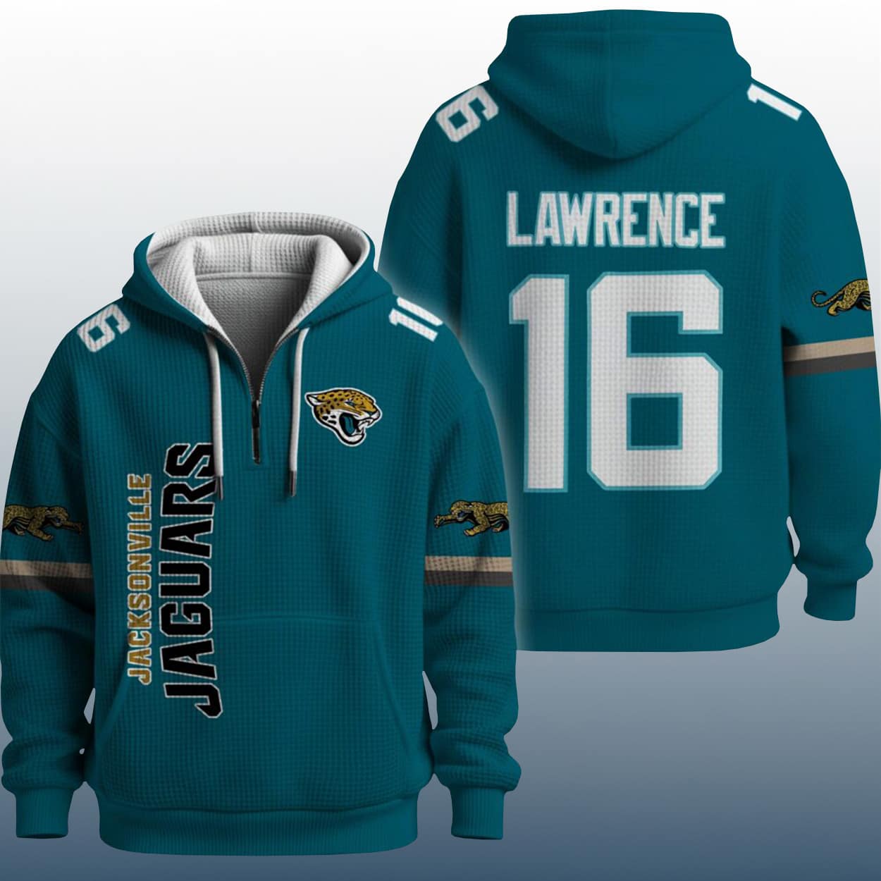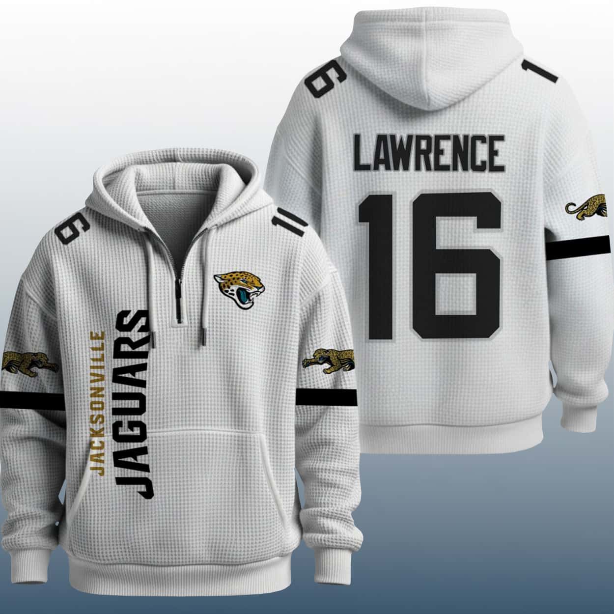 Show off your Jaguars pride with the 16 Lawrence Jaguars Quarter Zip Waffle Hoodie—where bold graphics meet game-day swagger. A must-have for fans who love standout style and quarterback energy.