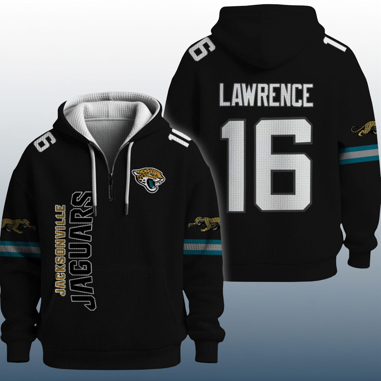 Step into the spotlight with this hoodie—a fan favorite that’s as fierce as the team it represents. The front features the iconic Jaguars logo on the chest, flanked by the number “16” on both shoulders, a nod to star quarterback Trevor Lawrence. Down the left side, “JAGUARS” runs vertically like a rally cry. The sleeves bring extra bite with jaguar graphics and sleek black-and-gold stripes that scream team spirit. Flip it around and you’ll find “LAWRENCE” boldly printed above a jumbo “16,” making it clear who you’re backing every Sunday.