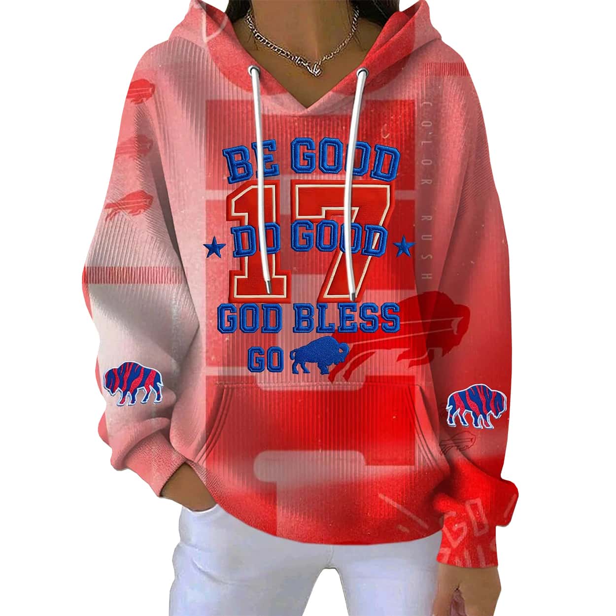 This isn’t just a hoodie—it’s a manifesto in motion. This hoodie blends streetwear swagger with sports devotion. Splashed in vibrant red and white stripes, it features dynamic buffalo graphics and a powerful lineup of words: “BE GOOD,” “DO GOOD,” “GOD BLESS,” and “GO.” Front and center, the number 17 stands tall—a nod to Buffalo Bills quarterback Josh Allen, the heartbeat of the team. With stylized buffalo logos on the sleeves and chest, this hoodie doesn’t whisper fandom—it shouts it.