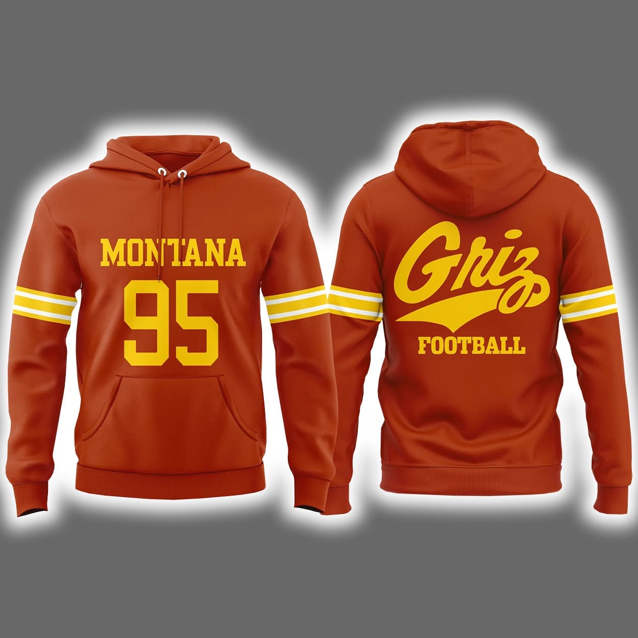 Step into the spirit of ’95 with this head-to-toe tribute to the Montana Grizzlies football dynasty. The hoodie sports a rich reddish-brown hue with bold yellow and white sleeve stripes, crowned by the iconic “MONTANA 95” front print and a roaring “Griz FOOTBALL” shout-out on the back. The joggers keep the energy flowing with matching red tones and a punchy yellow “Griz” graphic on the thigh—perfect for flexing team pride on the move. Top it off with the cap: a structured red classic featuring “MONTANA 95” front and a cheeky chili pepper mascot on the side, adding a dash of playful heat to your game-day look.