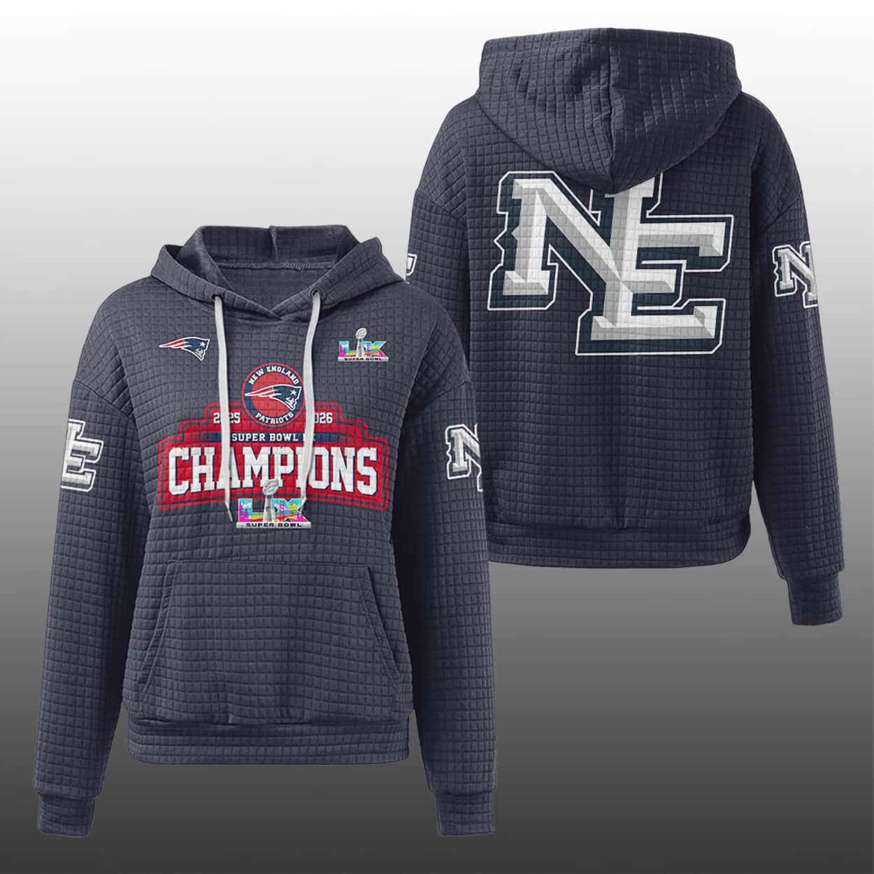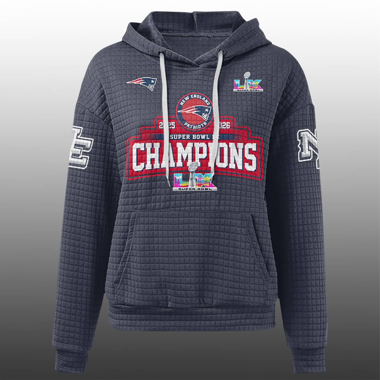 Celebrate victory in style with the 2025-2026 New England Football SB LX Champions Waffle Hoodie—an electrifying tribute to gridiron greatness, designed for fans who wear their pride loud and proud.