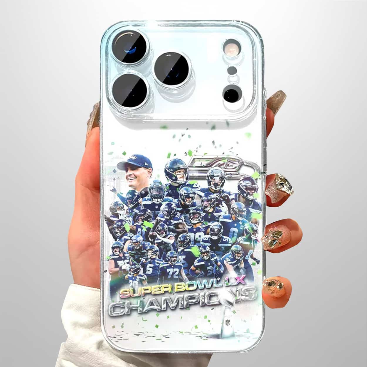 This design is more than decoration; it’s a story of resilience, teamwork, and triumph. Inspired by the electric atmosphere of the championship celebration, the case captures the joy of victory and the unity of the Seahawks family. It’s a statement piece for fans who think big, dream boldly, and aren’t afraid to show their colors. Every glance at the case is a reminder of the roar of the crowd, the confetti raining down, and the thrill of seeing the Seahawks crowned champions once again.
