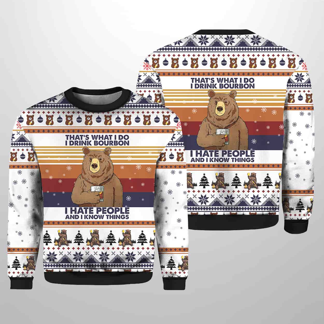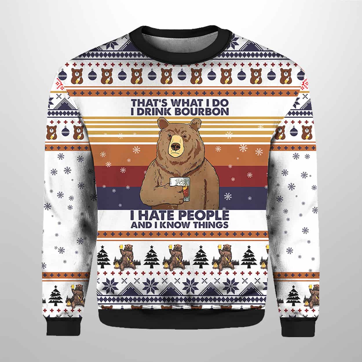 Step aside, traditional holiday cheer—make room for this sweater. This eye-catching sweater features a dapper bear in a brown coat, casually sipping bourbon with the confidence of someone who’s seen it all. Set against a backdrop of retro sunset stripes in orange, red, and purple, the design is framed by playful snowflakes, Christmas trees, and bear icons. The bold text reads: “THAT’S WHAT I DO. I DRINK BOURBON. I HATE PEOPLE. AND I KNOW THINGS.” It’s a hilarious nod to the introvert with refined taste and zero tolerance for nonsense.