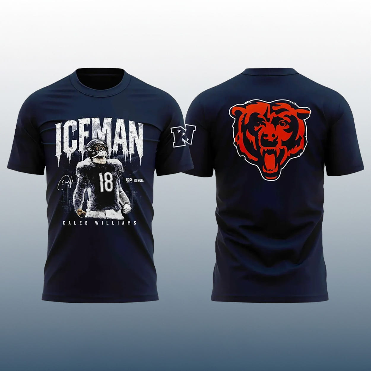 Step into the future of football fashion with this shirt. The front showcases a dynamic graphic of Caleb in full gear, rocking jersey number 18 and a confident pose that screams “QB1 energy.” Above him, the nickname “ICEMAN” blazes in bold white letters—because cool under pressure is his signature style. Below, his name anchors the design, flanked by a stylized signature that adds a personal touch. Flip it around and boom—the back hits hard with the iconic Chicago Bears bear head logo, roaring in orange and outlined in black. It’s fierce, it’s fresh, it’s football.