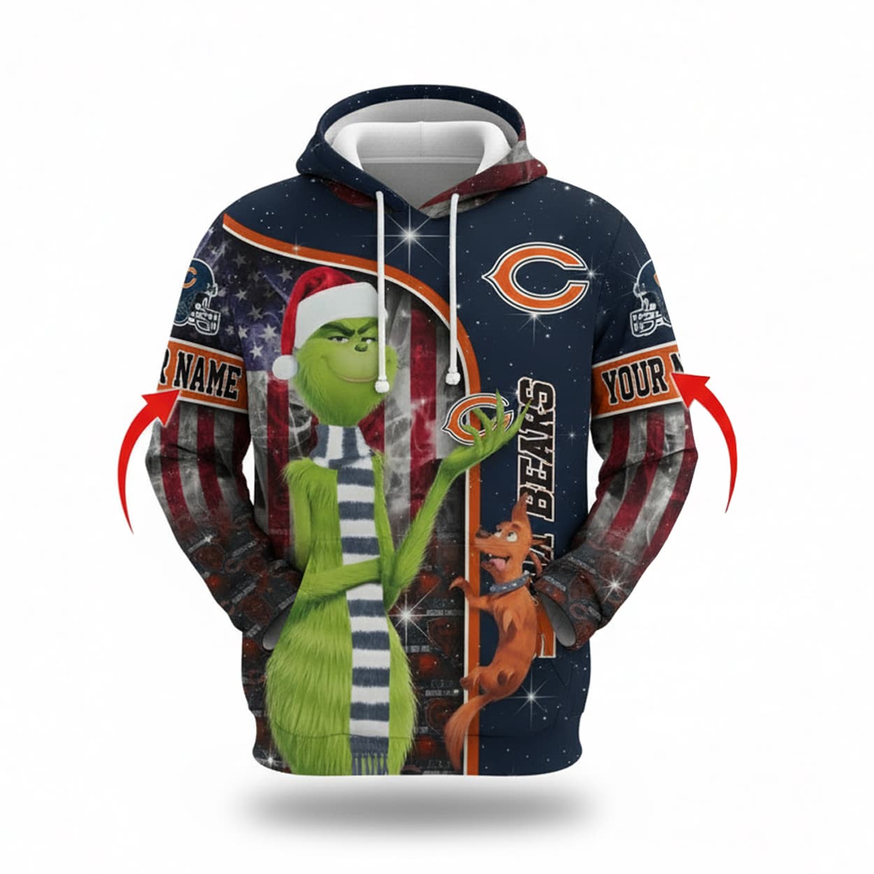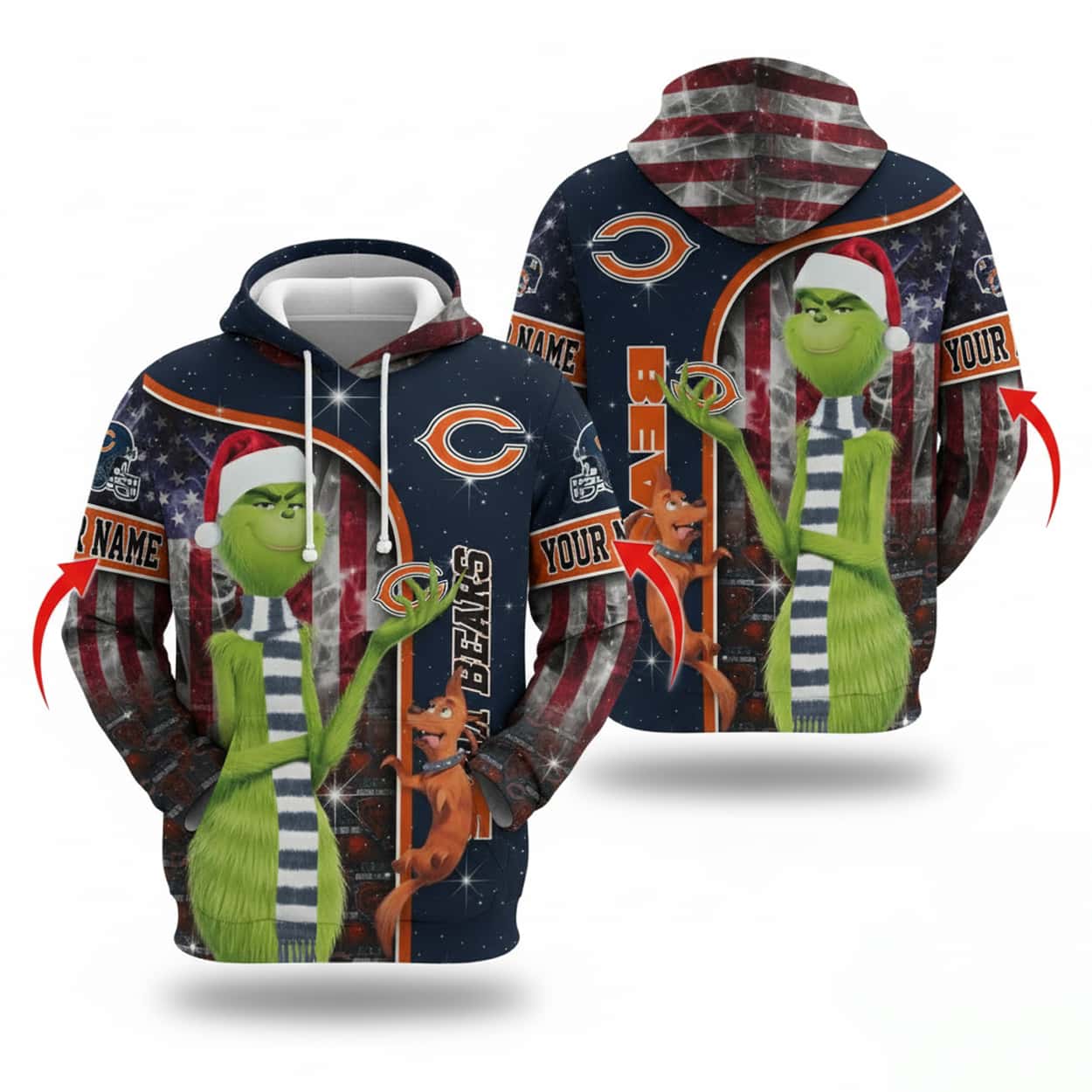 Get ready to turn heads this holiday season with this hoodie—a playful mashup of Christmas spirit and Bears pride. On the front and back, the Grinch sports a Santa hat and striped scarf, joined by a cheeky cat companion. Behind them, the American flag waves proudly amid falling snowflakes, setting the scene for a winter wonderland with attitude. The bold “BEARS” text runs vertically, flanking the team’s logo, while the sleeves offer a customizable name area so you can make it truly yours.