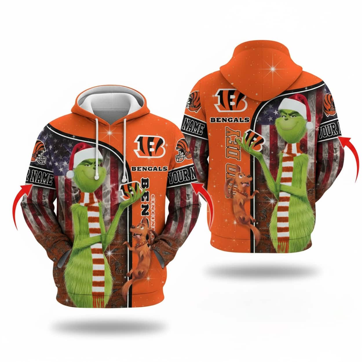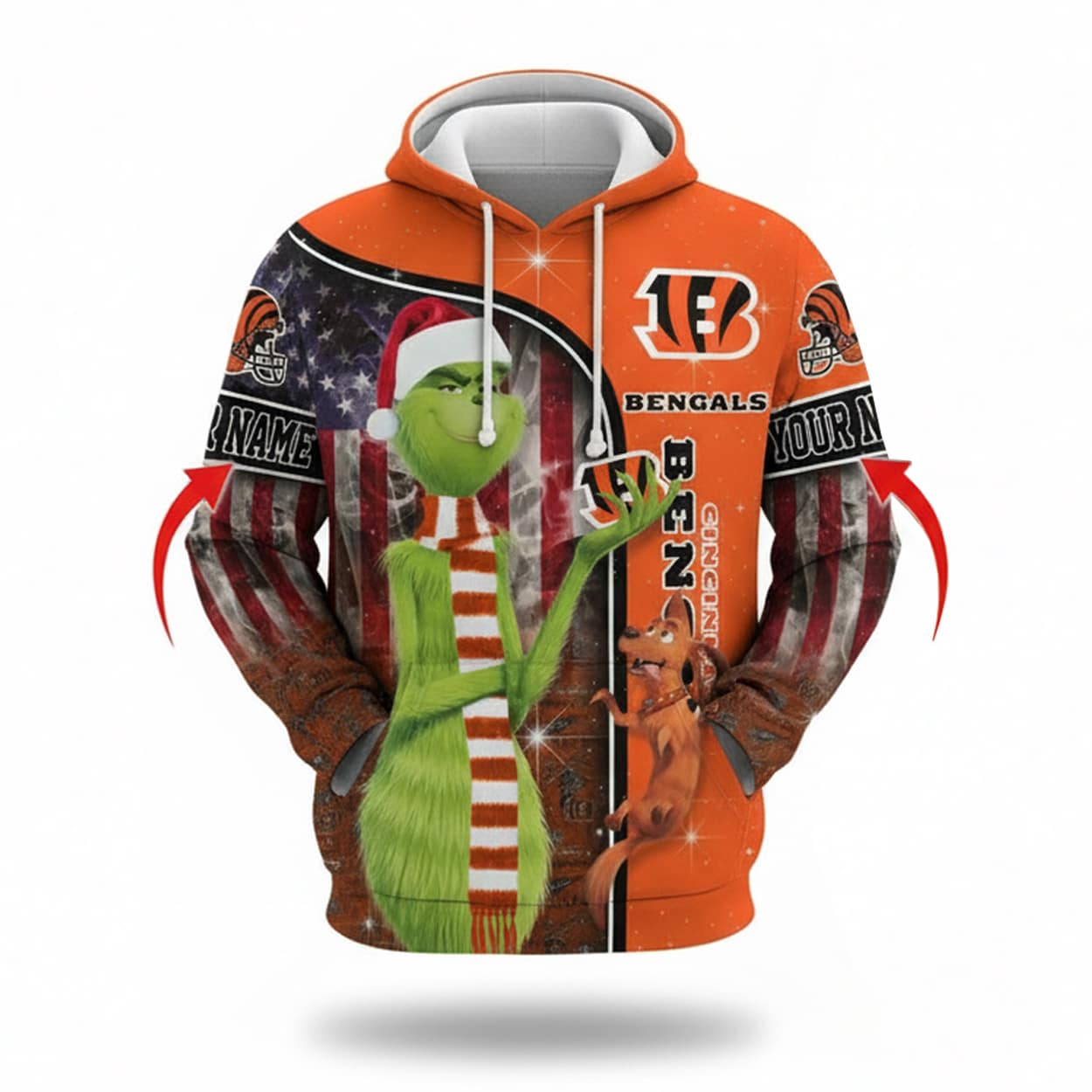 This isn’t your average holiday hoodie. This hoodie explodes with energy, blending the rebellious charm of the Grinch with the firepower of Bengals fandom. On both the front and back, the Grinch grins mischievously in a red-and-white striped scarf, clutching a Bengals logo like he’s about to run it into the end zone. Behind him, a bold American flag motif waves proudly, while flaming footballs and the unmistakable Bengals logo roar across the design. With “BENGALS” emblazoned in dynamic lettering, this hoodie is a full-throttle celebration of sport and spirit.