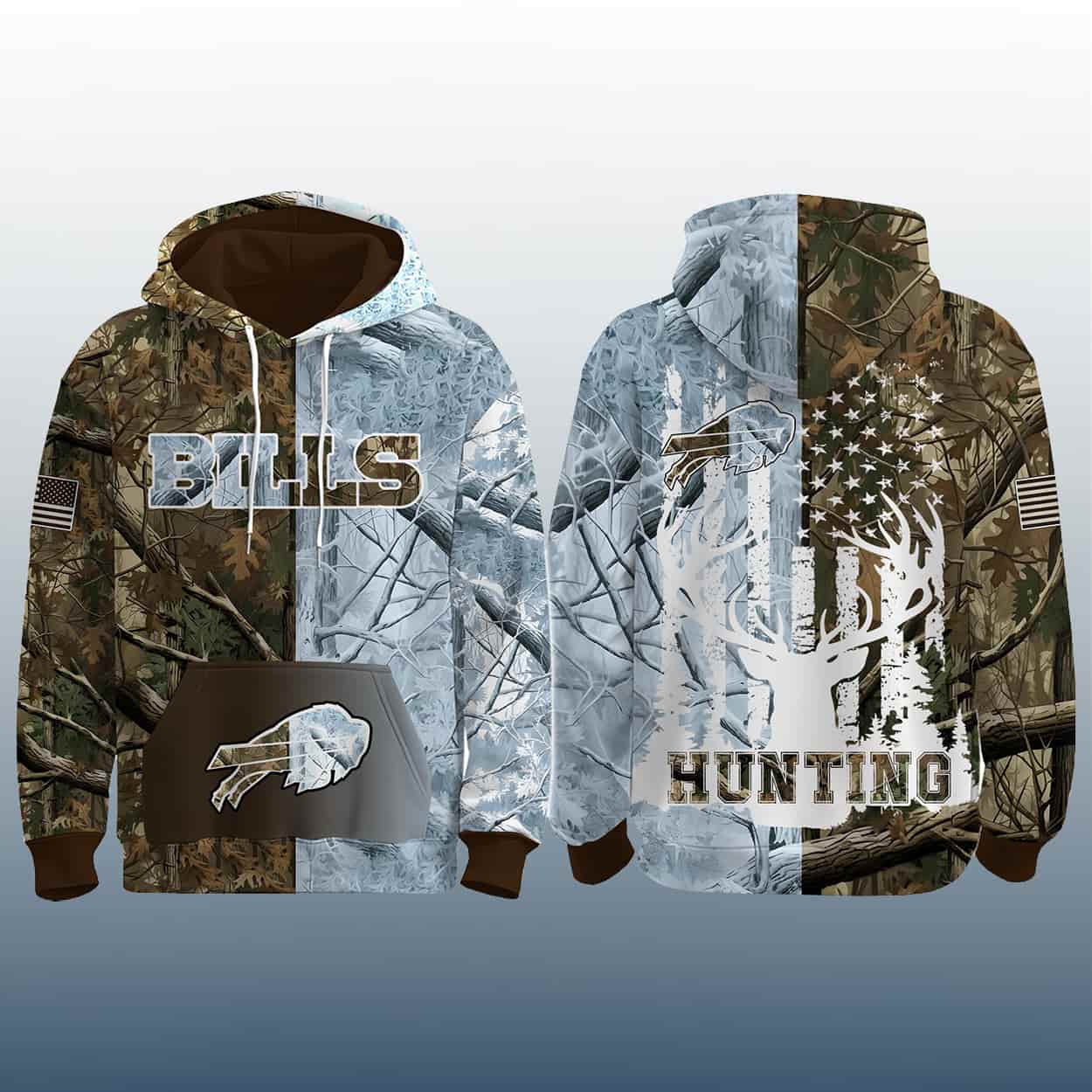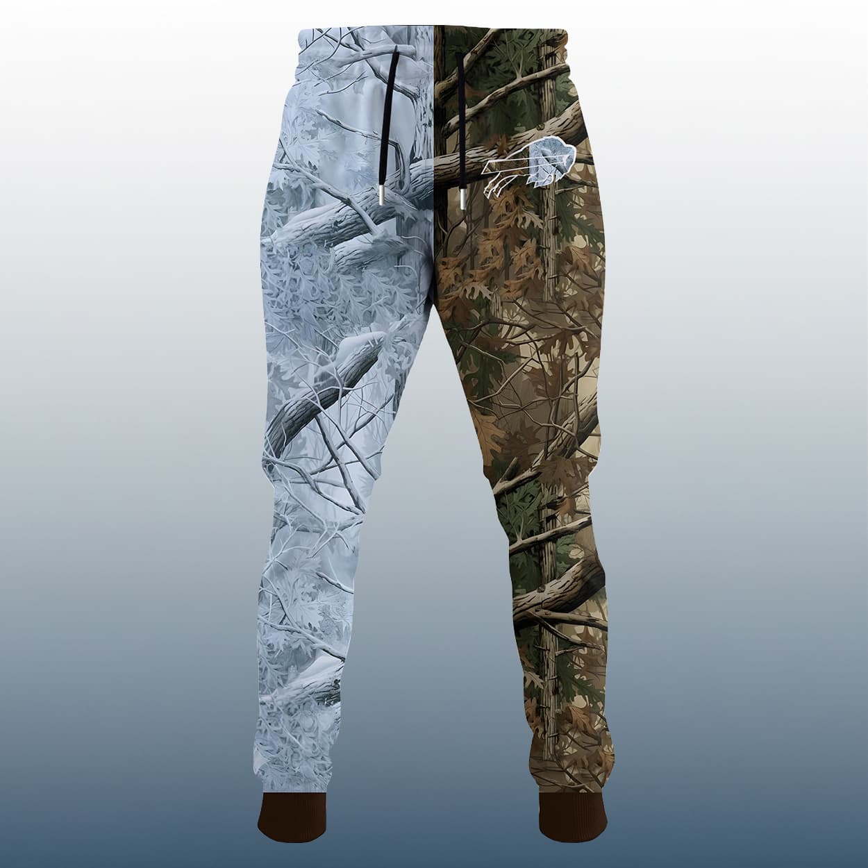 Step into the wild zone with this combo—a head-to-toe tribute to rugged fandom. The hoodie steals the spotlight with its split-camo design: one half in deep woodland tones, the other in icy snow camo. Across the chest, “BILLS” roars in bold camo-filled letters, anchored by a fierce buffalo head. Flip it around and you’ll find a majestic white deer silhouette with antlers, backed by a stylized American flag and the word “HUNTING” stamped below. The joggers echo the camo contrast, while the cap ties it all together with matching patterns and a subtle nod to the hunt.