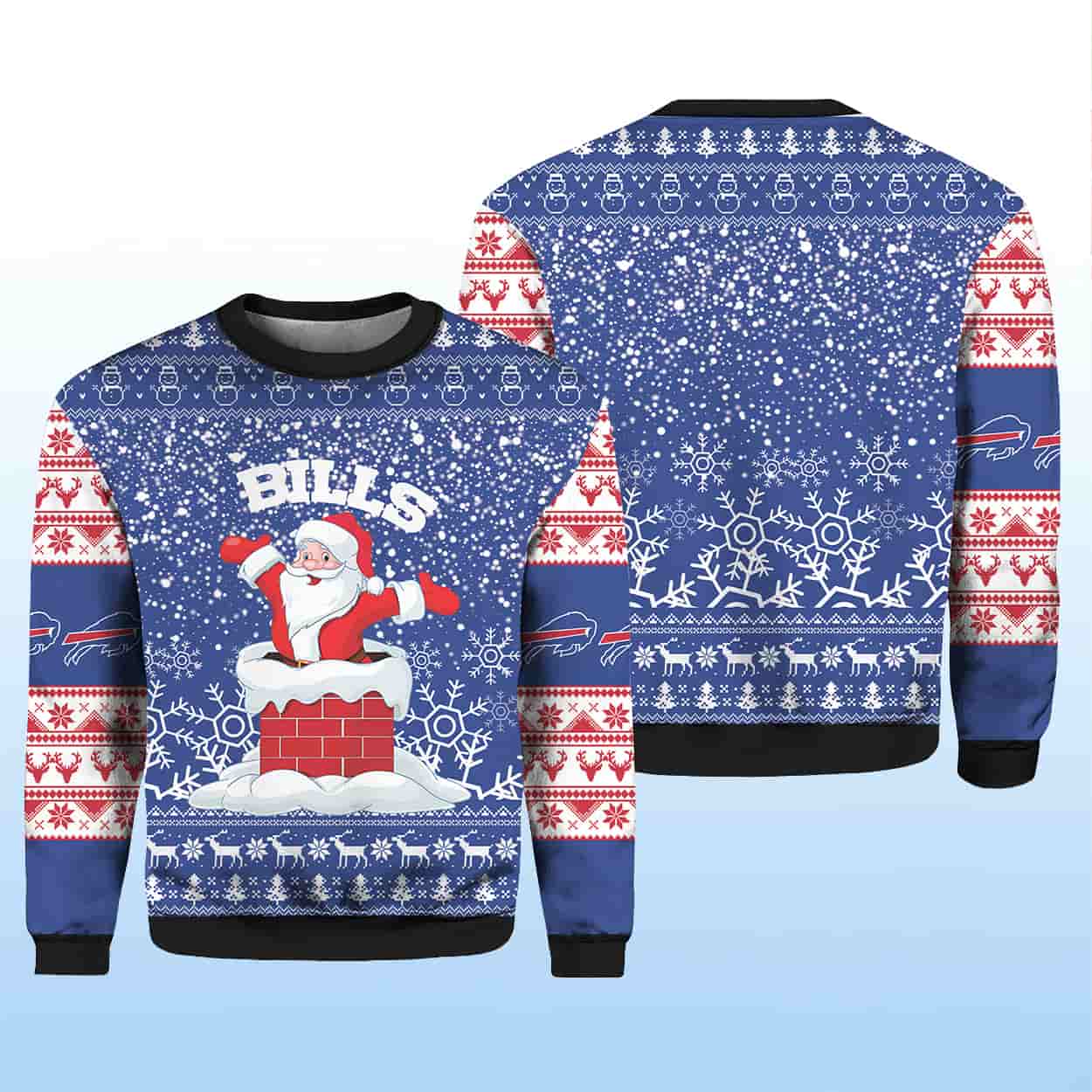 This isn’t just a sweater—it’s a declaration of joy, loyalty, and a little bit of mischief. Inspired by fans who love their football as much as their festivities, the design blends traditional holiday charm with the bold energy of Bills Nation. Santa’s chimney escape is a nod to the unexpected plays and unforgettable moments that make the season magical—on and off the field.