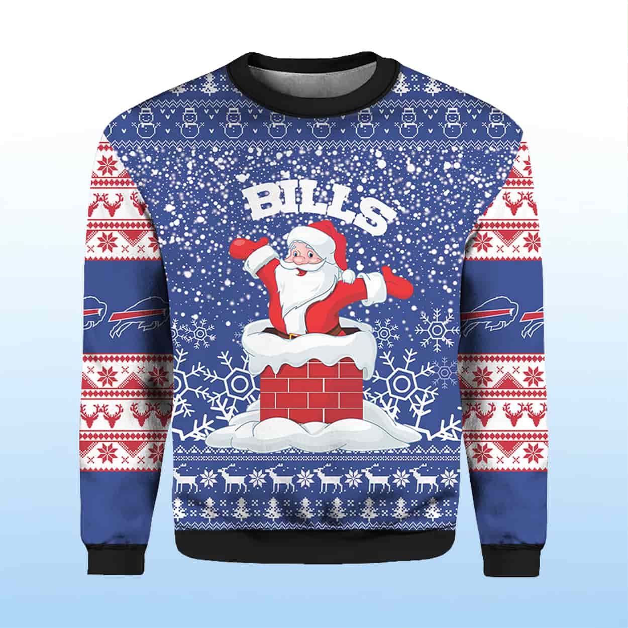 Get ready to jingle all the way to game day with this sweater! This eye-catching masterpiece features a cartoon Santa popping out of a red brick chimney, surrounded by playful snowflakes and topped with bold white “BILLS” lettering. The sleeves and upper chest are decked out in red, white, and blue holiday motifs—think snowflakes, reindeer, and hearts—all arranged in classic sweater fashion. The back continues the winter wonderland vibe, complete with more snowflakes and the unmistakable Bills logo on each sleeve. It’s a cozy celebration of team spirit and seasonal silliness.