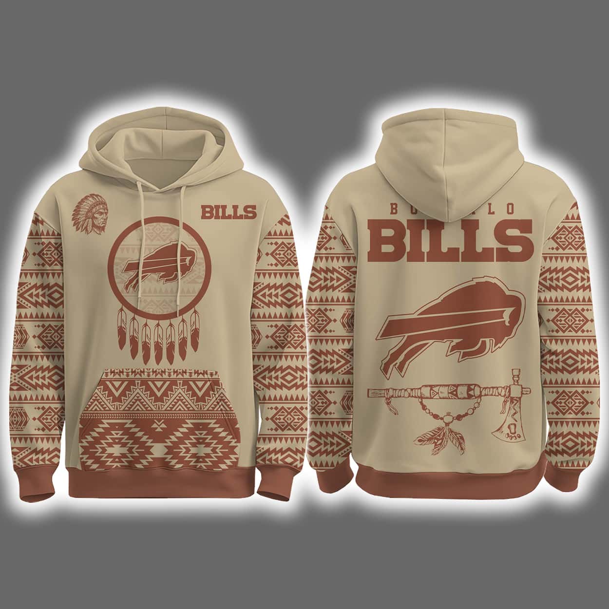 This collection isn’t just apparel—it’s a conversation. Inspired by Native American artistry and the enduring spirit of the buffalo, each piece honors tradition while celebrating the resilience of the Bills community. The tomahawk and feather motifs symbolize strength, unity, and respect, making this set a bold expression of cultural pride and team loyalty.