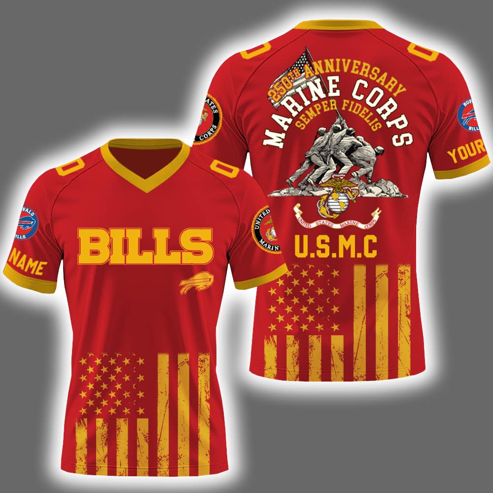 Introducing the 2025 Bills x U.S Marine Corps 250th Year Anniversary Football Jersey, a bold fusion of athletic pride and military honor. Drenched in commanding red with vivid yellow accents, this jersey radiates strength and unity. The front features “BILLS” in large yellow block letters, paired with the Buffalo Bills logo—an unmistakable nod to team spirit. Flip it around, and the back delivers a powerful tribute: “250th Anniversary Marine Corps Semper Fidelis” crowns a detailed illustration of the iconic Iwo Jima flag-raising scene. Beneath it, “U.S.M.C.” stands tall in yellow, anchoring the design in historical reverence. The sleeves add a personal touch with “YOUR NAME” patches and Marine Corps insignia, making this jersey as unique as the legacy it honors.