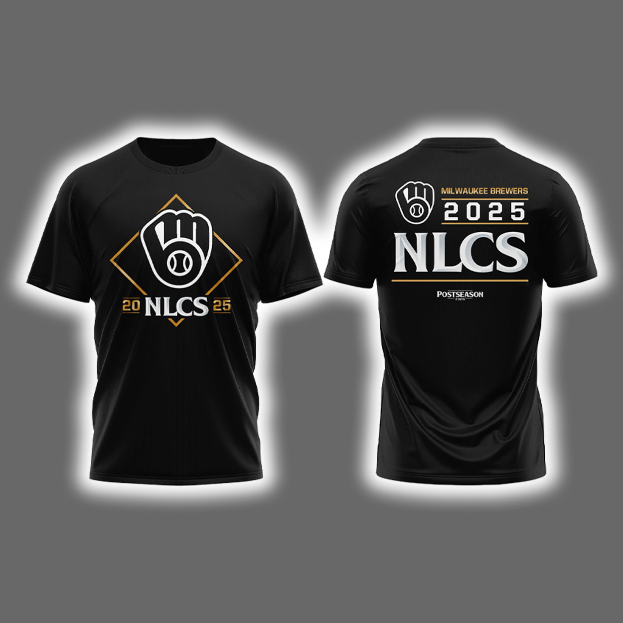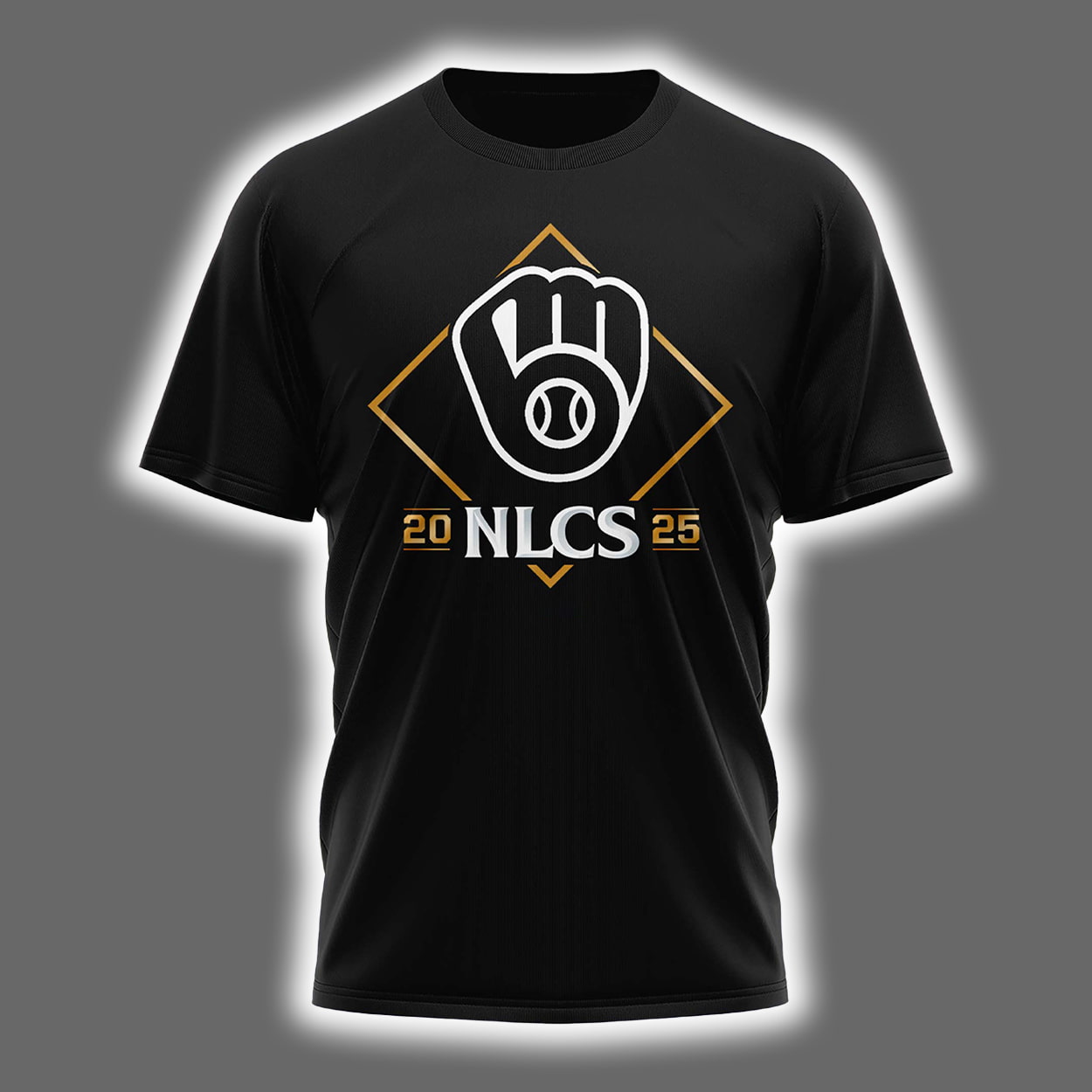 Step into the spotlight with this shirt—a wearable tribute to Milwaukee’s unforgettable playoff journey. The front showcases the Brewers’ classic glove logo nestled inside a golden diamond, flanked by “20” and “25” in gleaming gold. Just below, “NLCS” pops in bold white, declaring your allegiance to the crew that brought the heat to October. Flip it around and you’ll find “MILWAUKEE BREWERS” in regal gold, followed by a crisp “2025” and a commanding “NLCS” that practically shouts postseason pride. At the base, “POSTSEASON” seals the deal like a walk-off homer.