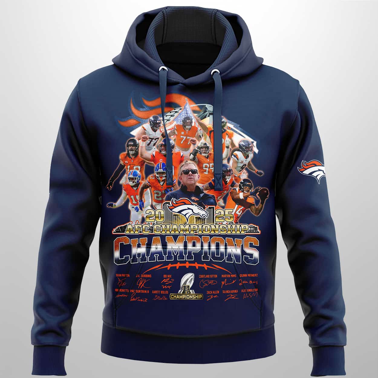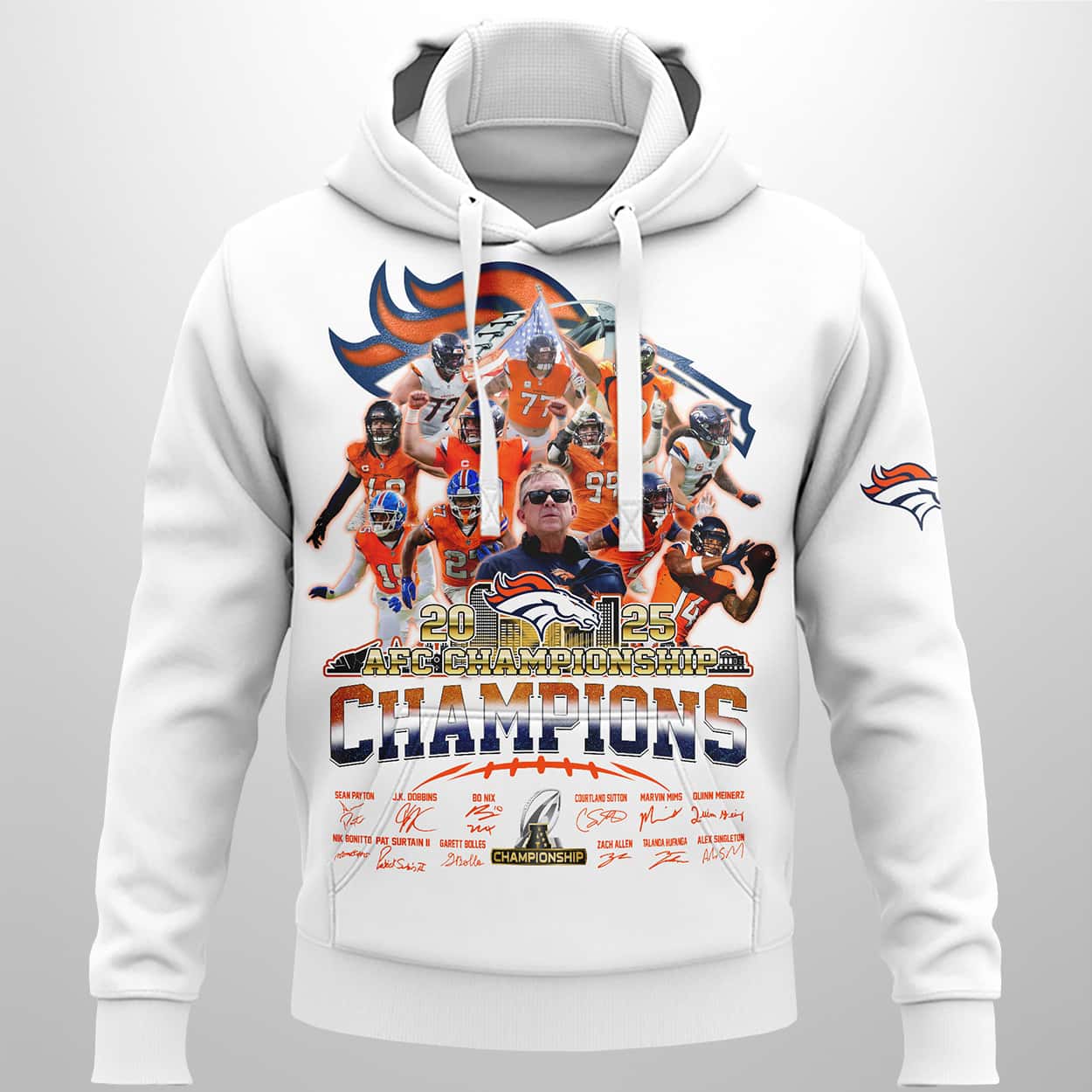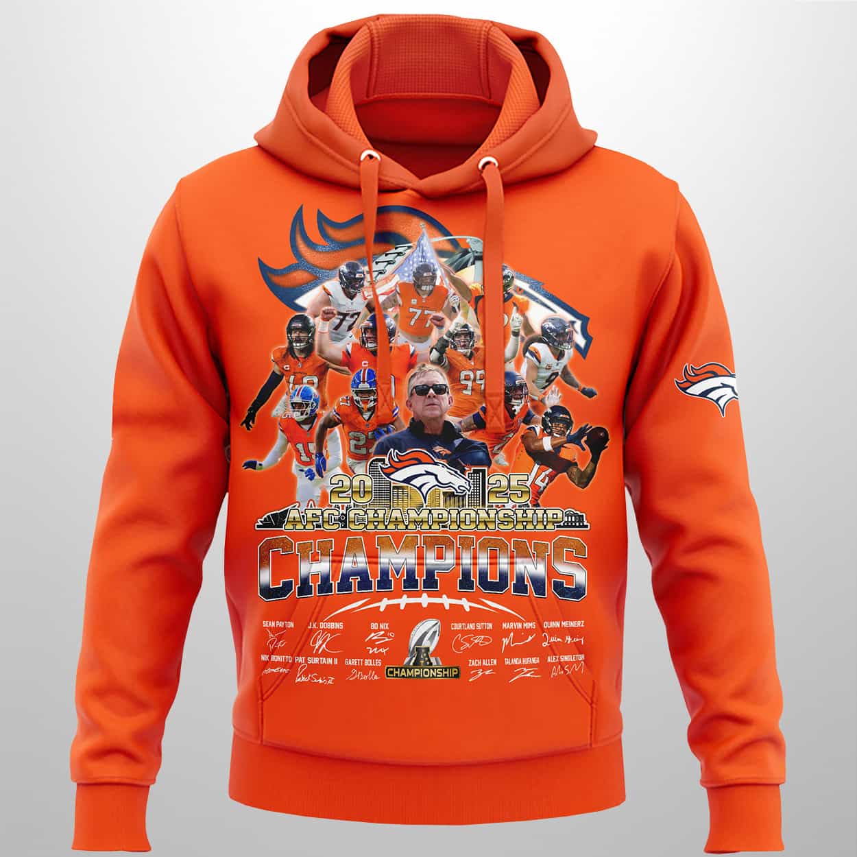 This design is a tribute to the “clutch-time experts” who turned Empower Field at Mile High into a fortress. It captures the spirit of a team that defied the odds, transitioning from the “quarterback desert” to AFC supremacy. The lower half of the design features the authentic signatures of fan favorites like Bo Nix, Courtland Sutton, and Patrick Surtain II, making it a true collector’s item. Whether you’re at the stadium or walking the streets of Denver, this hoodie tells the world you value resilience, strategy, and the orange-and-blue legacy.