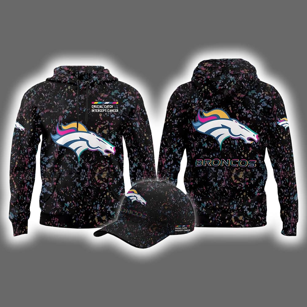 Unleash your inner champion with the 2025 Broncos Crucial Catch Intercept Cancer Hoodie Cap. Featuring rainbow splatter art and the iconic Broncos logo, this gear blends fierce fandom with fearless advocacy.