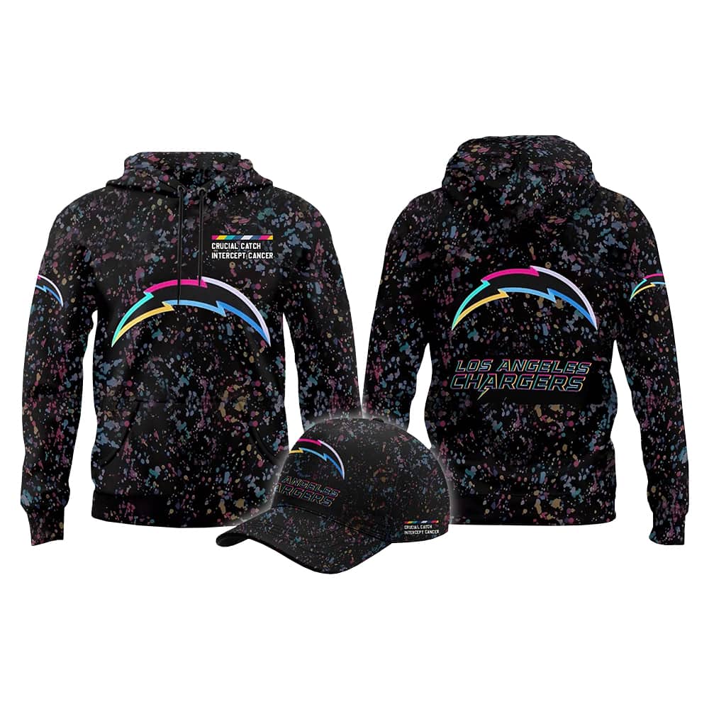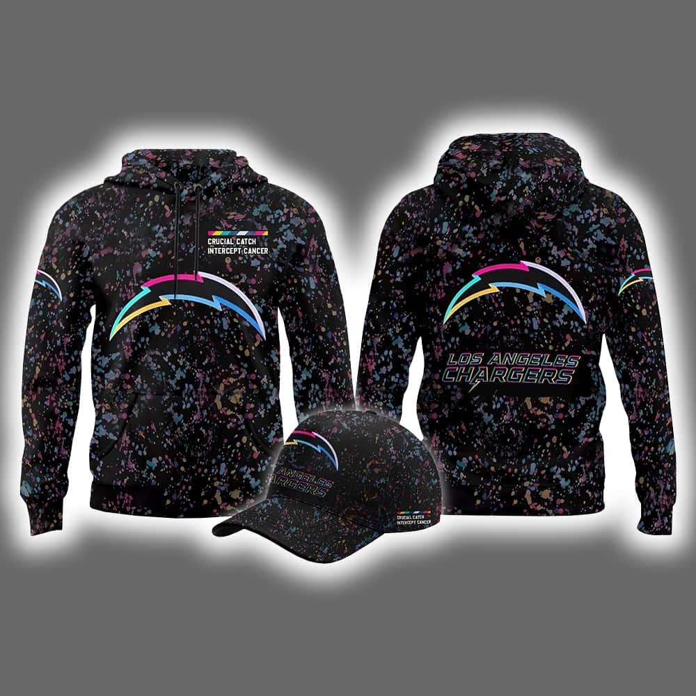 Get ready to charge into the season with the 2025 Chargers Crucial Catch Intercept Cancer Hoodie Cap. This eye-catching combo includes two hooded sweatshirts and a matching baseball cap, all drenched in a vibrant splatter-paint design over a sleek black canvas. The front of the hoodie showcases the Chargers bolt logo in electrifying hues. Flip it around and the back amps up the pride with a larger logo and bold team name. The cap completes the look with matching colors and a front-and-center bolt that says, “I’m here, and I care.”
