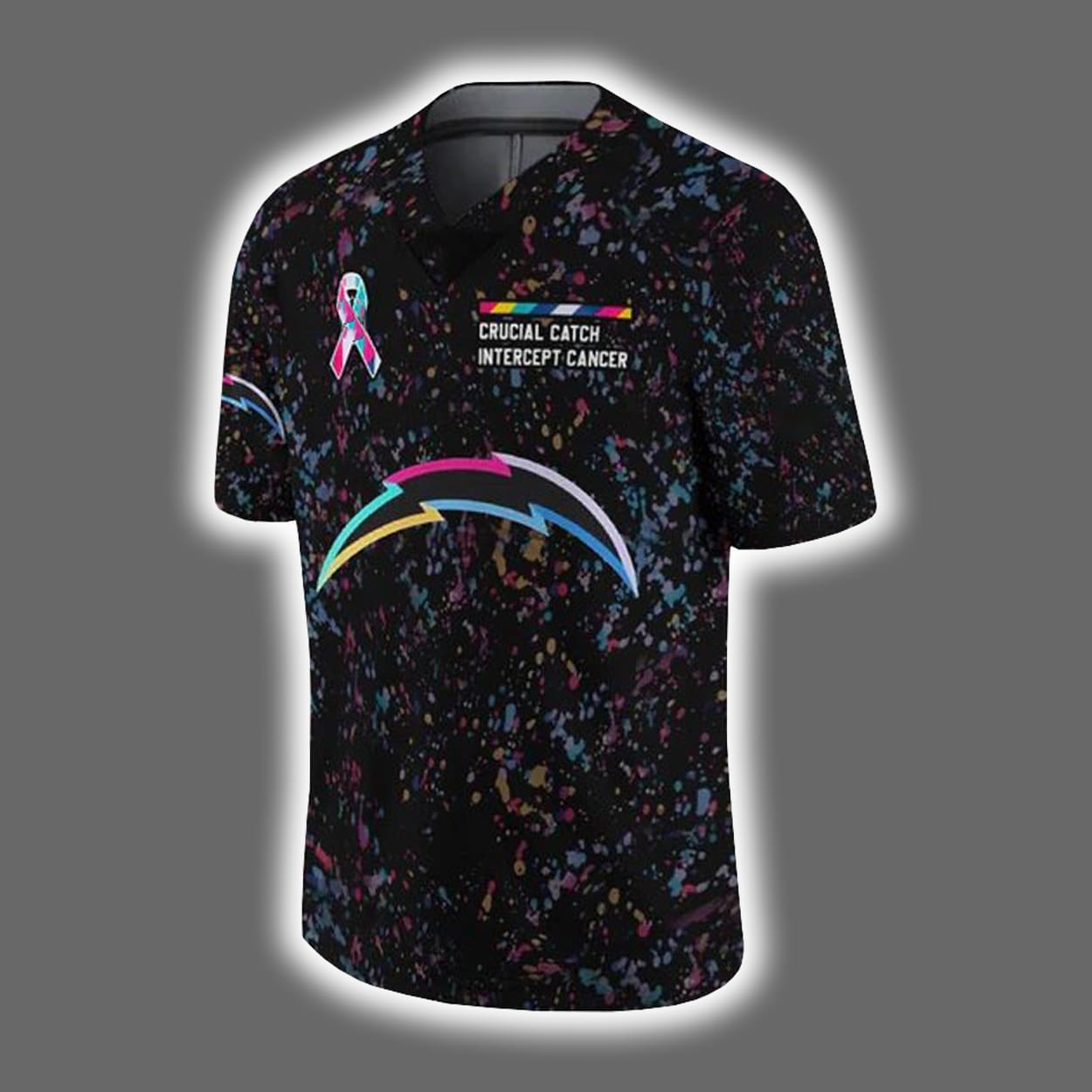 This jersey is a visual touchdown. It explodes with a vibrant splatter of rainbow hues that scream energy and optimism. Front and center, a stylized lightning bolt logo in radiant rainbow colors strikes through the darkness, paired with the empowering phrase “CRUCIAL CATCH INTERCEPT CANCER” and a pink ribbon—a nod to the fight against cancer. On the reverse, the same lightning bolt surges above the bold “CHARGERS” text, ensuring your support is loud and proud from every angle.
