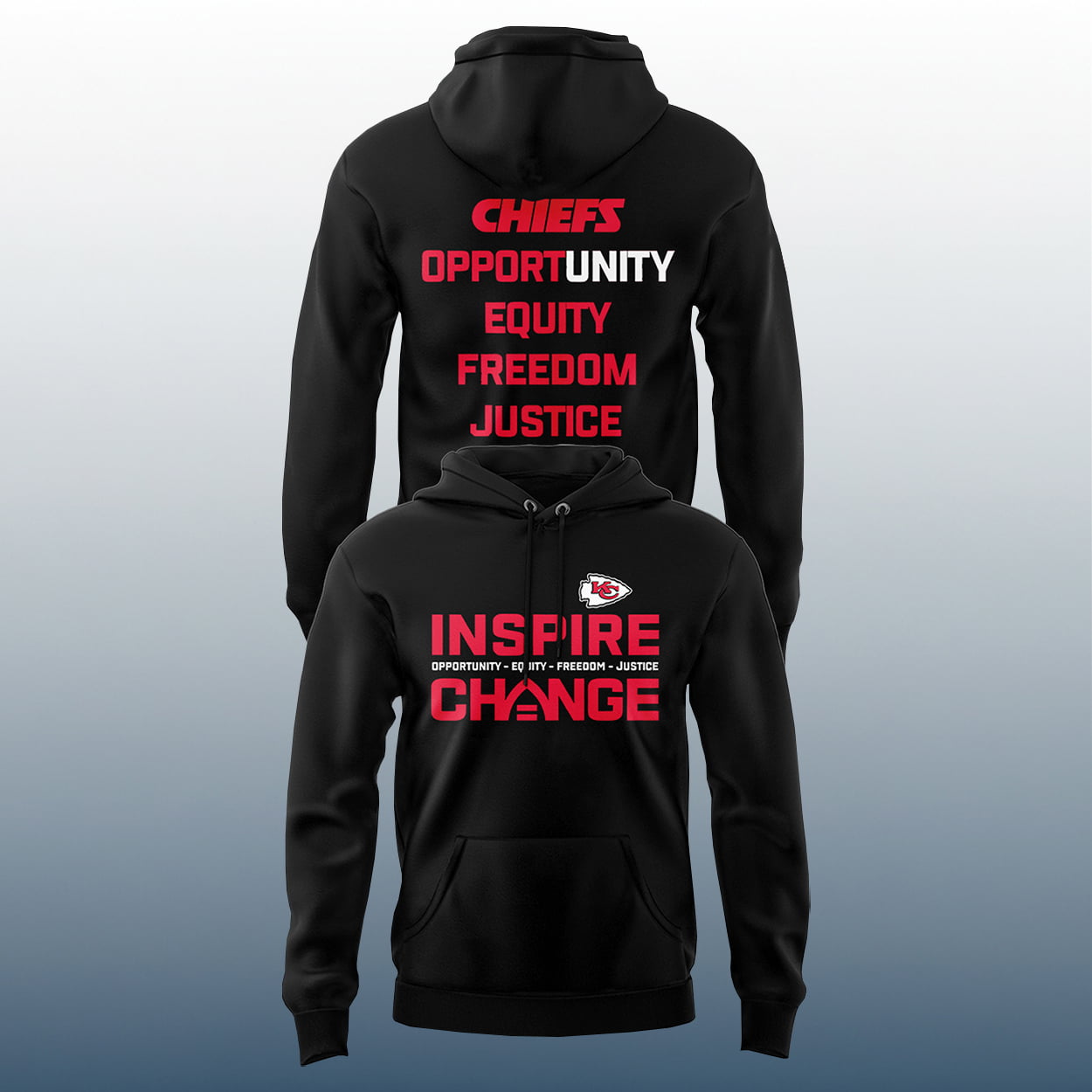 Step into the season with more than just team spirit—step in with purpose. This hoodie is a bold black pullover that fuses Chiefs pride with a powerful social message. On the front, the Chiefs logo sits proudly above the phrase “INSPIRE CHANGE,” followed by a statement that reads: “The football and its clubs support programs that reduce barriers to opportunity.” Flip it around, and the back hits you with a rallying cry in red and white block letters: “CHIEFS OPPORTUNITY EQUITY FREEDOM JUSTICE.” It’s not just a hoodie—it’s a declaration.