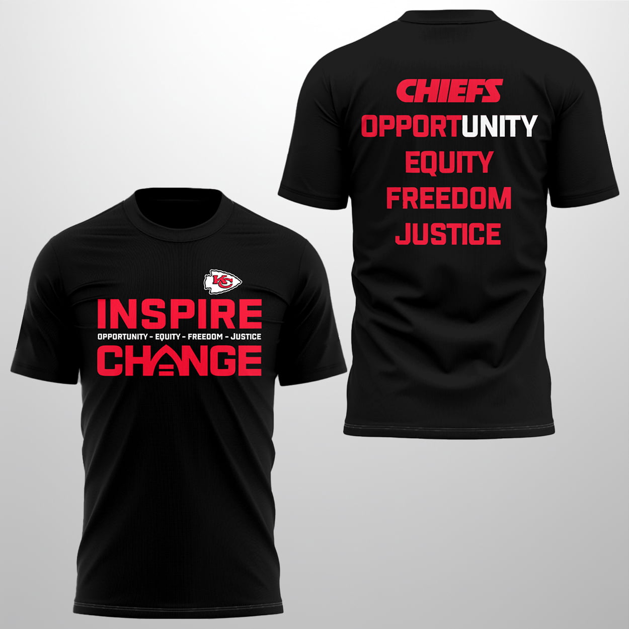 Turn heads and spark conversations with this shirt. The front proudly showcases the Chiefs logo above a rallying cry: “INSPIRE CHANGE,” followed by a lineup of values—OPPORTUNITY • EQUITY • FREEDOM • JUSTICE—in bold red and white typography. Flip it around and you’ll find “CHIEFS” leading the charge again, stacked above the same four values in a vertical formation. It’s not just a shirt—it’s a walking billboard for progress, pride, and purpose.