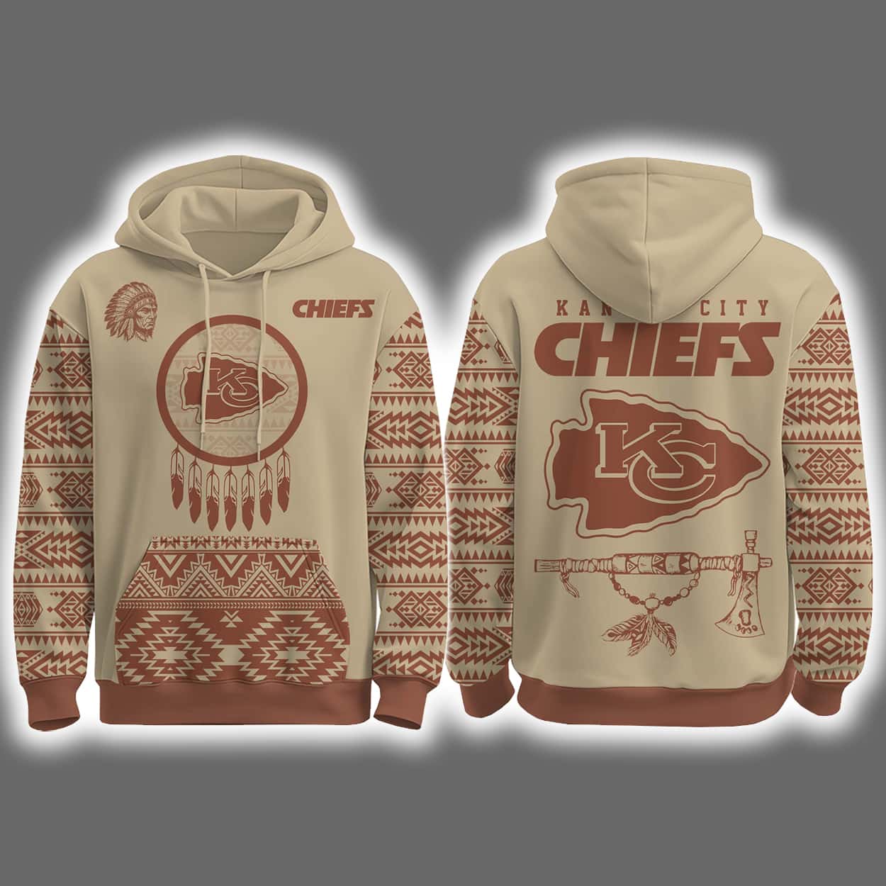 Game-day gear just got a cultural upgrade. This set is a bold tribute to legacy and loyalty. The hoodie features a warm beige base with red tribal-inspired patterns wrapping the sleeves and lower torso. Front and center, the Kansas City Chiefs logo sits proudly inside a circular frame, with five feathers cascading beneath it—because details matter. On the chest, “CHIEFS” pops in red, balanced by a profile of a Native American head on the opposite side.