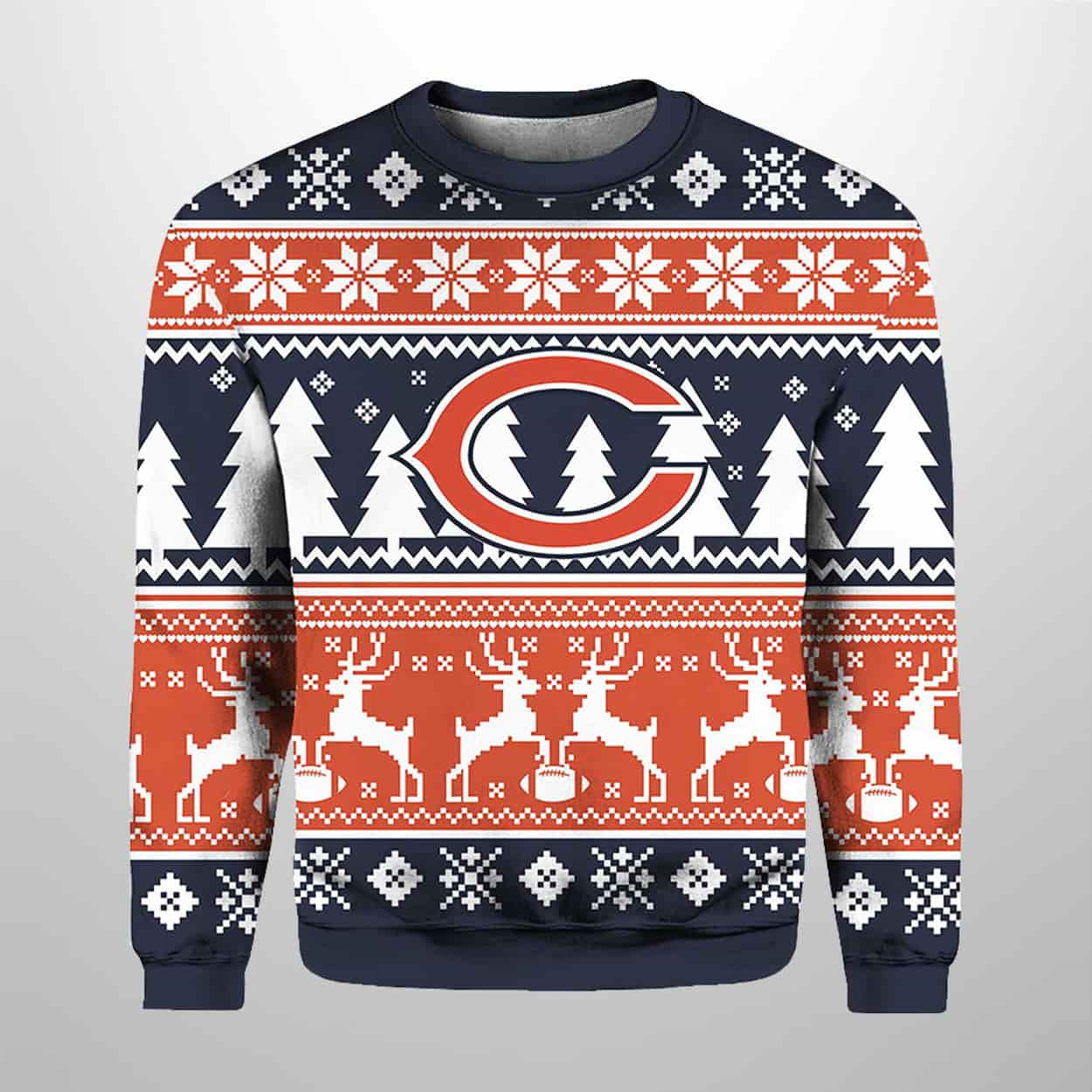 Get ready to jingle all the way to Soldier Field with this sweater! This festive fan-favorite blends classic holiday charm with fierce team spirit. The navy blue base sets the stage for a winter wonderland of white snowflakes, orange accents, and playful Christmas trees. Front and center, the iconic Bears “C” logo is reimagined with three snowy white trees nestled inside—like a forest of fandom. Flip it around and you’ll find bold orange “BEARS” lettering above a parade of white reindeer galloping into victory.