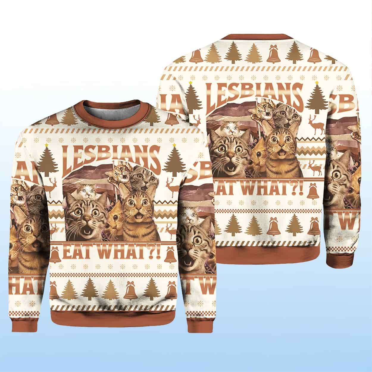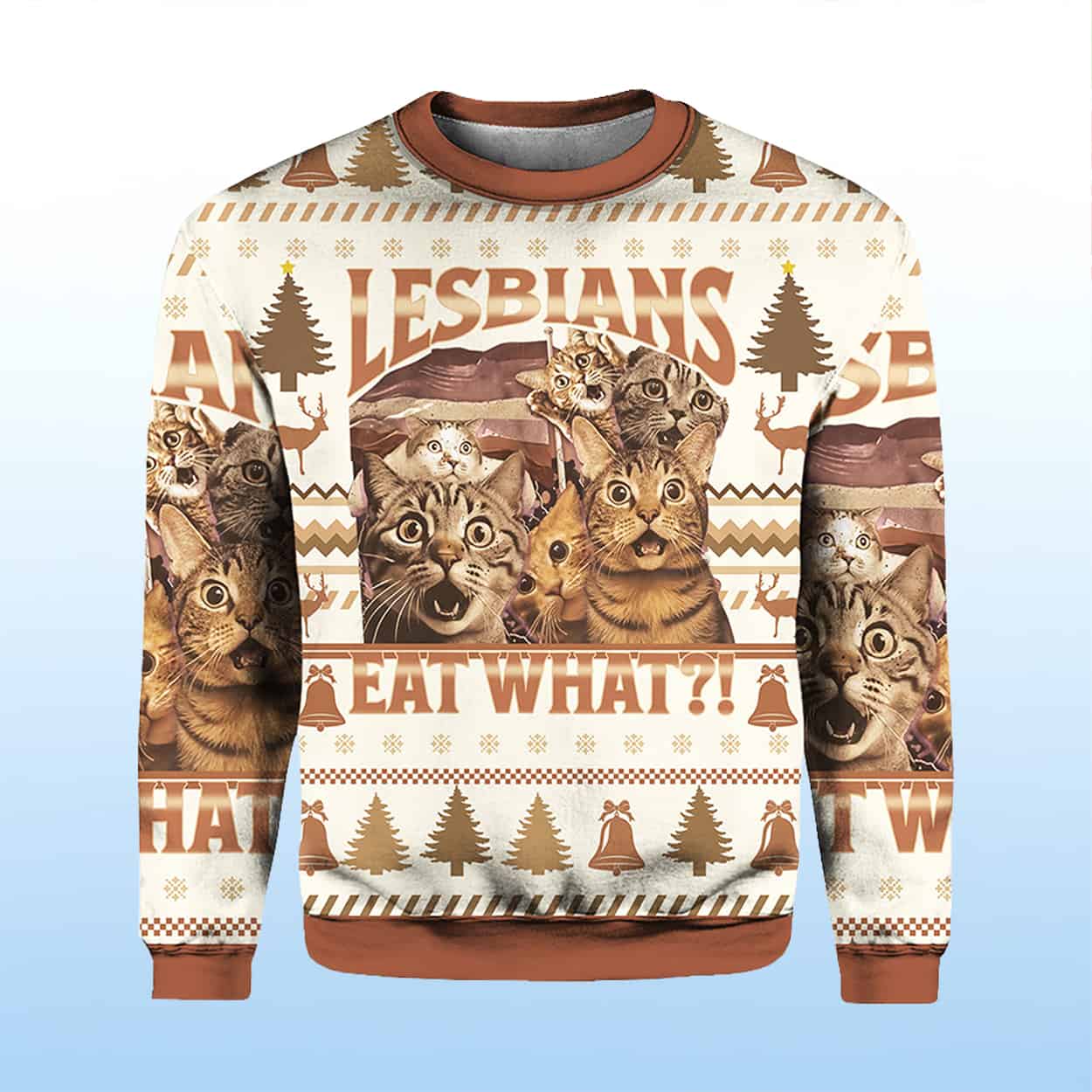 This sweater is not your grandma’s holiday knit. This hilariously provocative piece features a repeating pattern of wide-eyed cats, evergreen trees, and the unforgettable phrase: “LESBIANS EAT WHAT?!” splashed boldly across the front. The design is a playful collision of cozy Christmas charm and eyebrow-raising humor, blending traditional festive motifs with a punchline that’s guaranteed to start conversations. Whether you’re at a holiday party or just prowling around town, this sweater delivers feline flair with a side of sass.