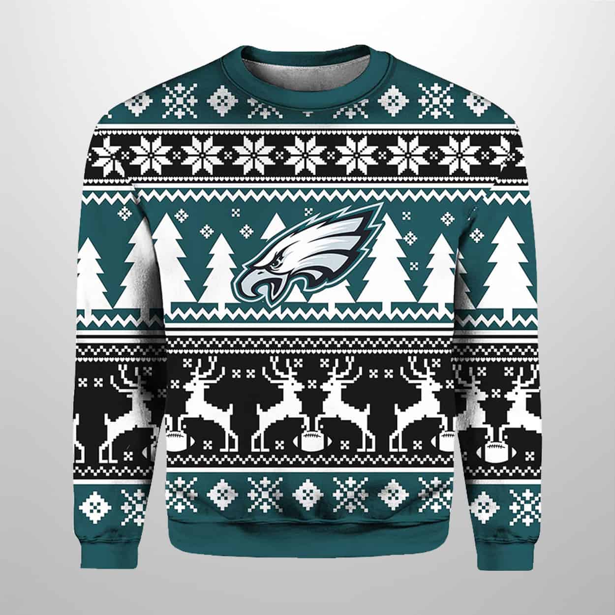 Celebrate the holidays with a touchdown of style in this sweater. This bold, winter-ready design features the iconic Eagles logo front and center, framed by a flurry of snowflakes, Christmas trees, and reindeer in classic team colors—green, black, and white. The back of the sweater proudly displays “EAGLES” in bold lettering above a parade of white reindeer, creating a symmetrical and spirited look from every angle. Whether you’re tailgating in December or cozying up by the fire, this sweater brings the perfect blend of gridiron grit and seasonal charm.