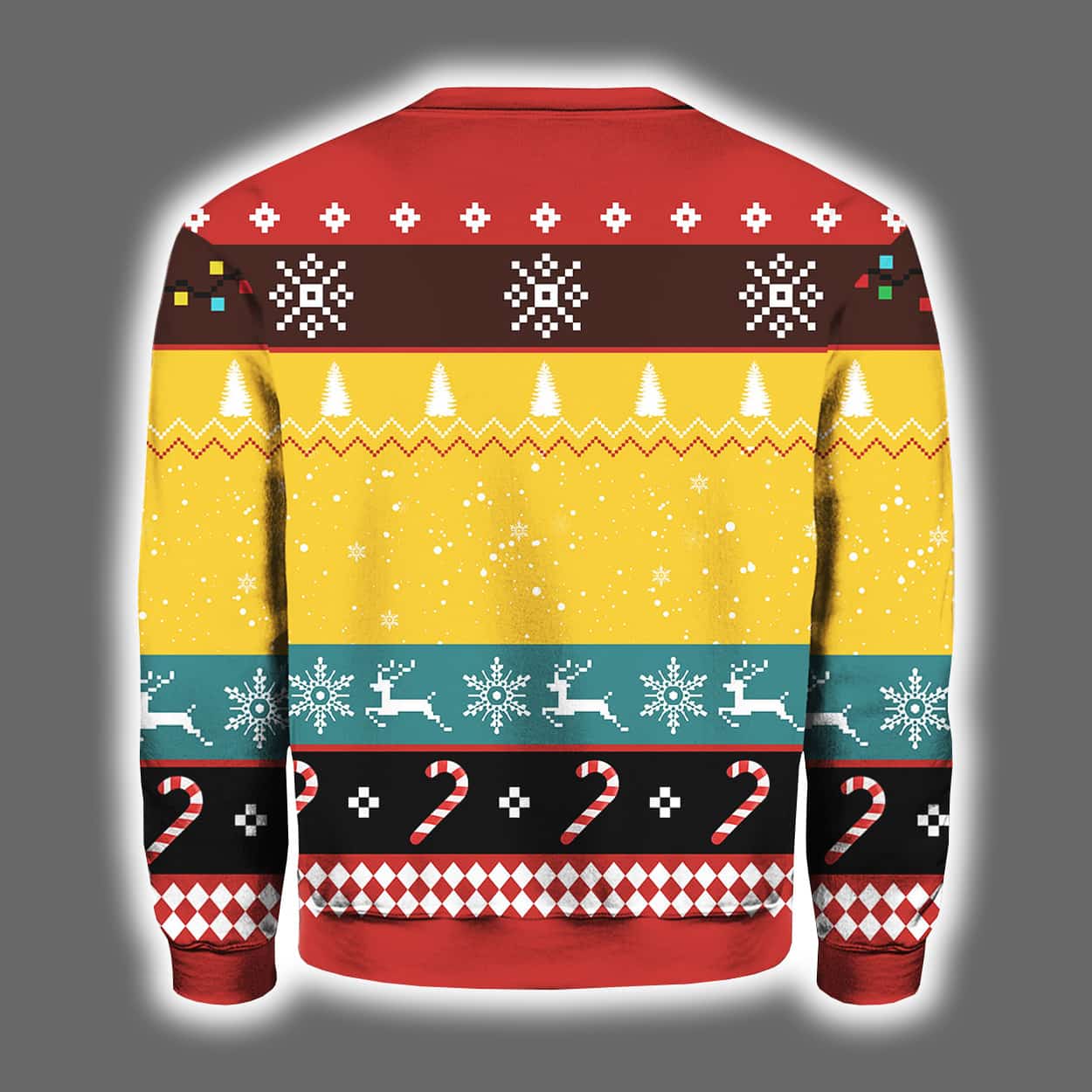 This isn’t just a sweater—it’s a celebration. Featuring a dynamic graphic of Jordan Love mid-play in his Packers uniform, this holiday masterpiece brings gridiron glory to your seasonal wardrobe. Surrounding the quarterback are classic Christmas motifs: snowflakes, candy canes, reindeer, and trees, all woven into a riot of red, green, yellow, and white. The Packers logo sits proudly beneath the action shot, while the back continues the festive pattern for holiday impact. Whether you’re tailgating in the snow or sipping cocoa by the fire, this sweater scores big on style.
