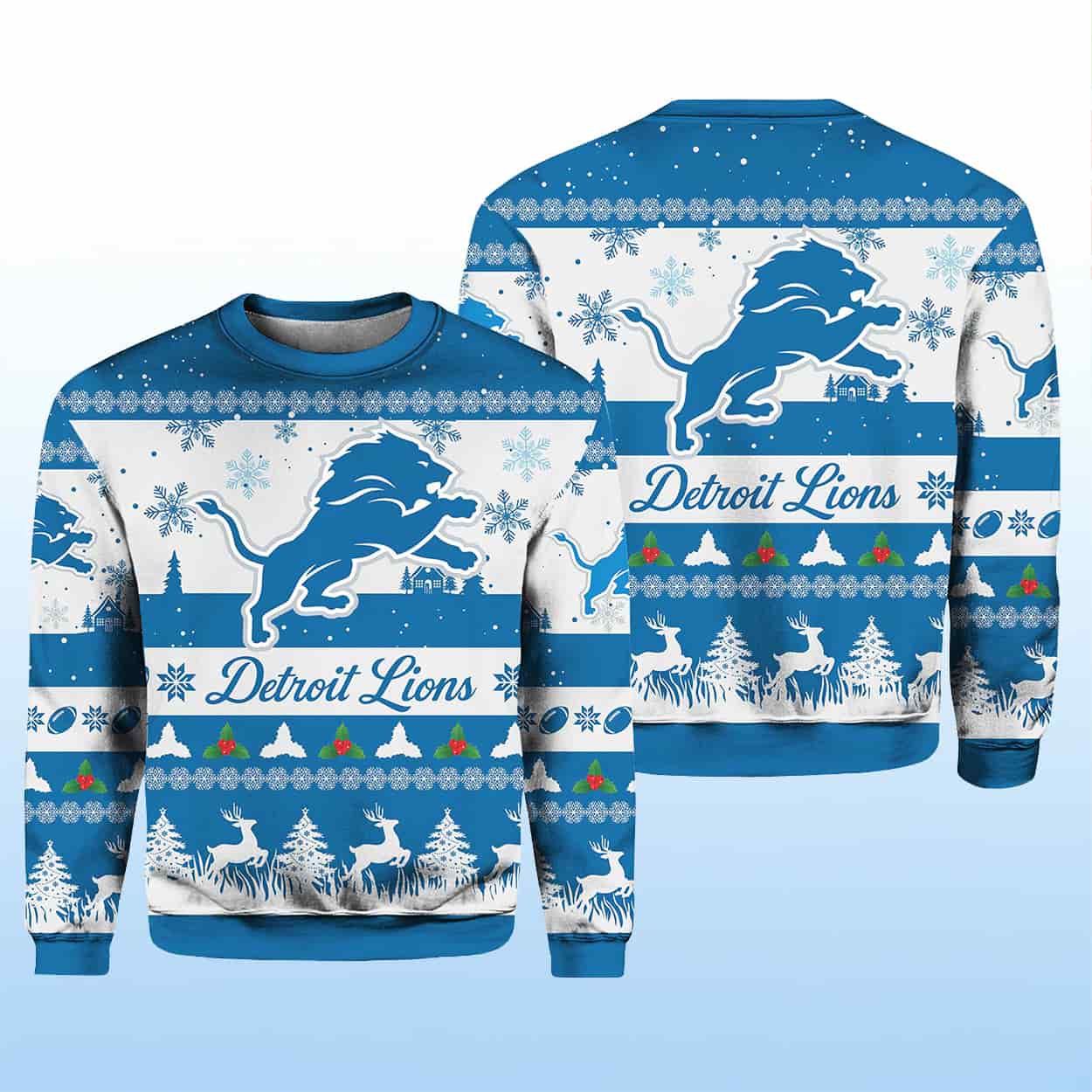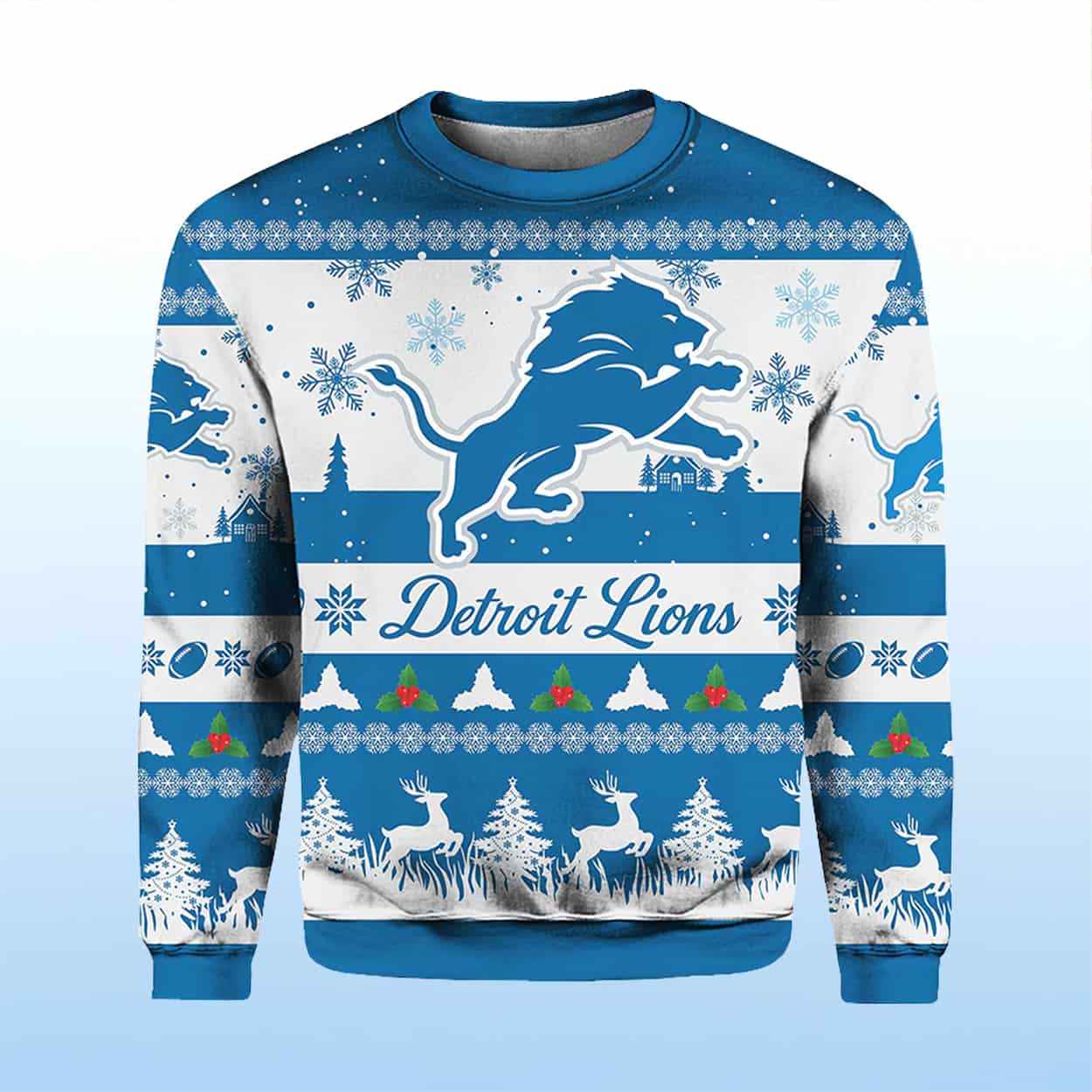 Get ready to tackle the season with this sweater—a bold blend of team pride and holiday cheer. This eye-catching sweater features the iconic Lions leaping lion logo front and center, flanked by festive rows of snowflakes, reindeer, Christmas trees, and twinkling light motifs. The rich blue and white palette pops with playful contrast, while the cursive “Lions” script adds a touch of vintage flair. With both front and back designs, you’ll be spreading team spirit from every angle.