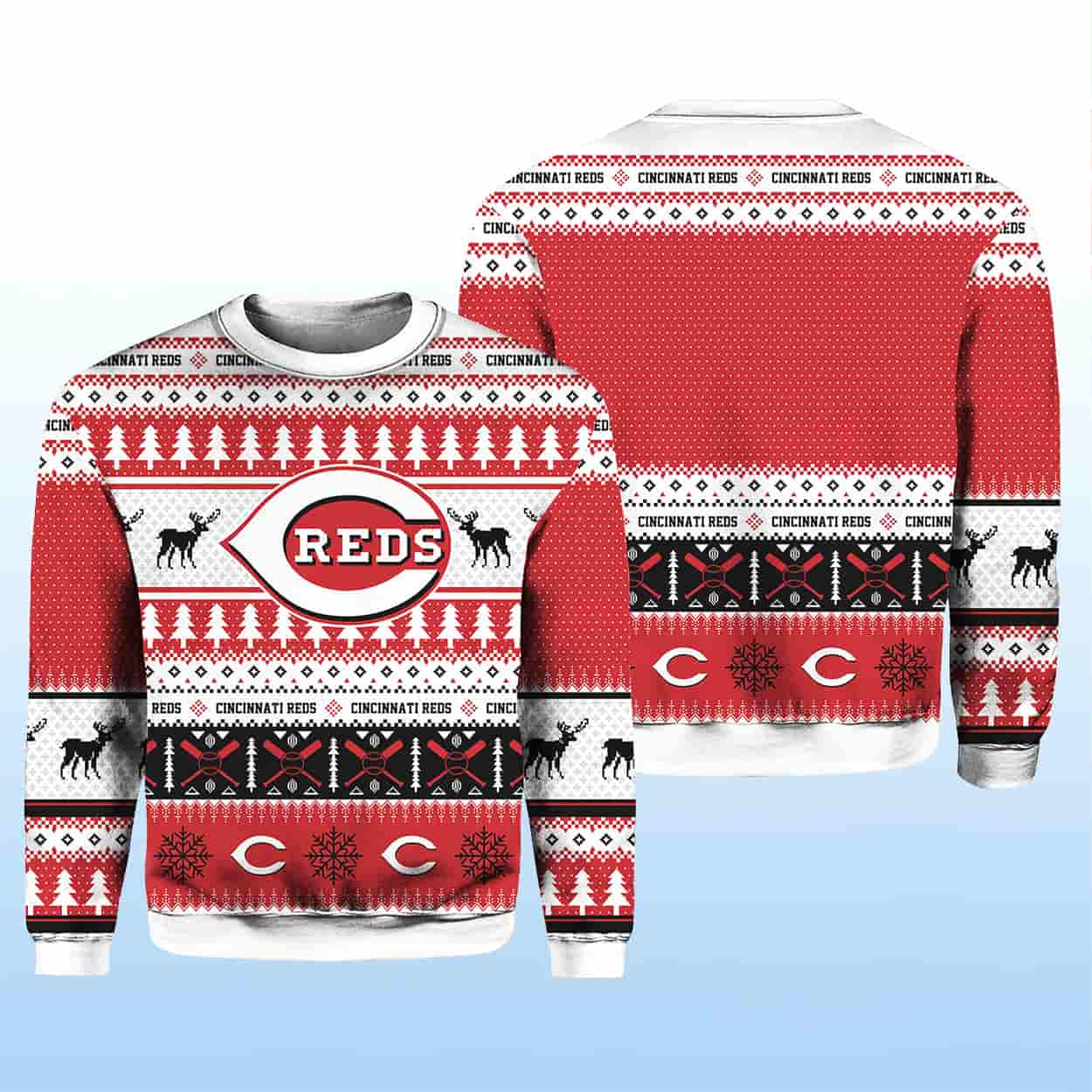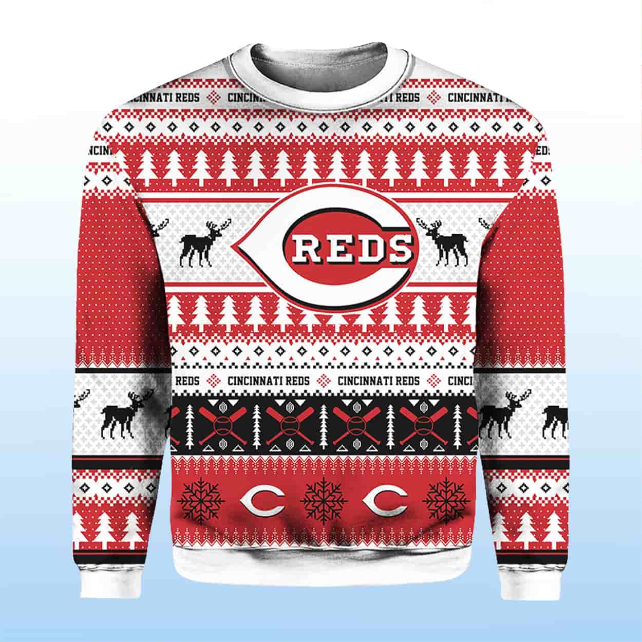 This sweater is a grand slam of festive flair and team pride. Dominated by bold reds, crisp whites, and classic blacks, this sweater features the unmistakable Cincinnati Reds logo—a white wishbone “C” cradling the word “REDS”—front and center. Surrounding it are playful holiday motifs: snowflakes, reindeer, and evergreen trees, all arranged in cheerful rows that wrap around the front and back. Near the hem, smaller team logos add a finishing touch, making this sweater a full-circle celebration of baseball and yuletide joy.