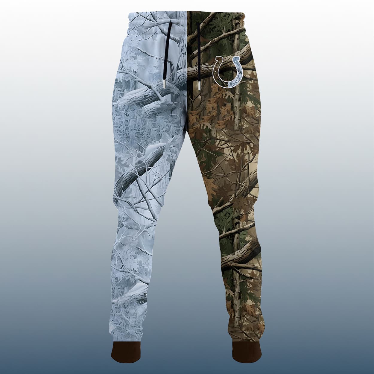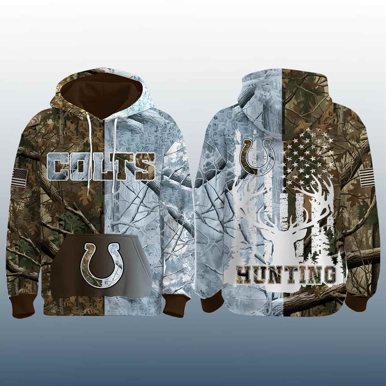 Step into the wild with this set—a head-to-toe tribute to rugged fandom. The hoodie’s front proudly showcases “COLTS” in bold lettering, anchored by the iconic horseshoe emblem, all set against a forest camouflage backdrop that screams team spirit with a hunter’s edge. Flip it around and you’re greeted by a stylized American flag, a majestic deer silhouette, and the word “HUNTING” stamped beneath—an homage to the thrill of the chase.