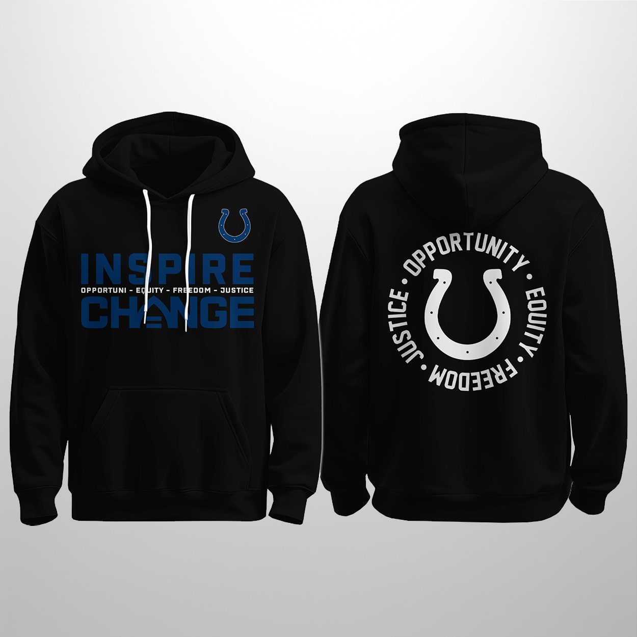 This hoodie is your ticket to repping the Colts with heart and purpose. On the front, a striking blue and white graphic declares “INSPIRE CHANGE” alongside the iconic Colts horseshoe. Just below, four words—“OPPORTUNITY – EQUITY – FREEDOM – JUSTICE”—line up like a playbook for progress. Turn it around and the back keeps the energy going: the white horseshoe sits center stage, surrounded by those same four values in a circular formation, creating a visual echo of unity and strength.