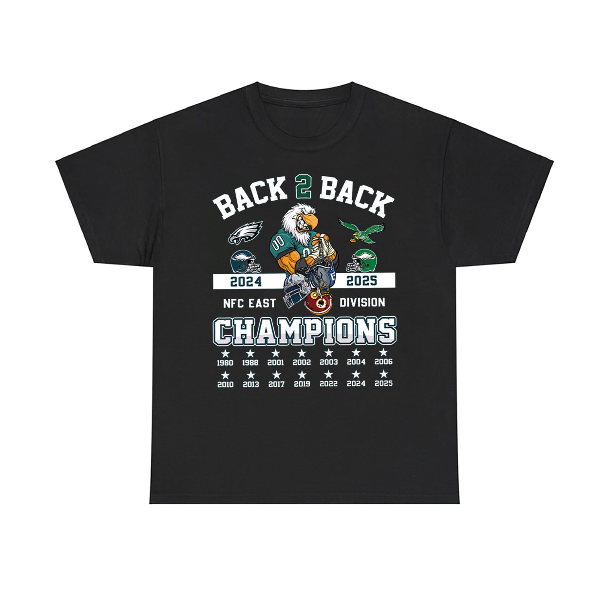 This shirt is a wearable victory lap for die-hard fans. Dominated by the triumphant phrase “BACK TO BACK” and the years “2024” and “2025,” this shirt proudly announces the Eagles’ consecutive NFC East Division wins. Front and center, the Eagles’ fierce mascot clutches a football with game-day swagger, flanked by the iconic team logos. Below, a roll call of championship years—from 1980 to 2023—cements Philly’s legacy in bold, celebratory type. It’s not just a shirt—it’s a scoreboard you can wear.