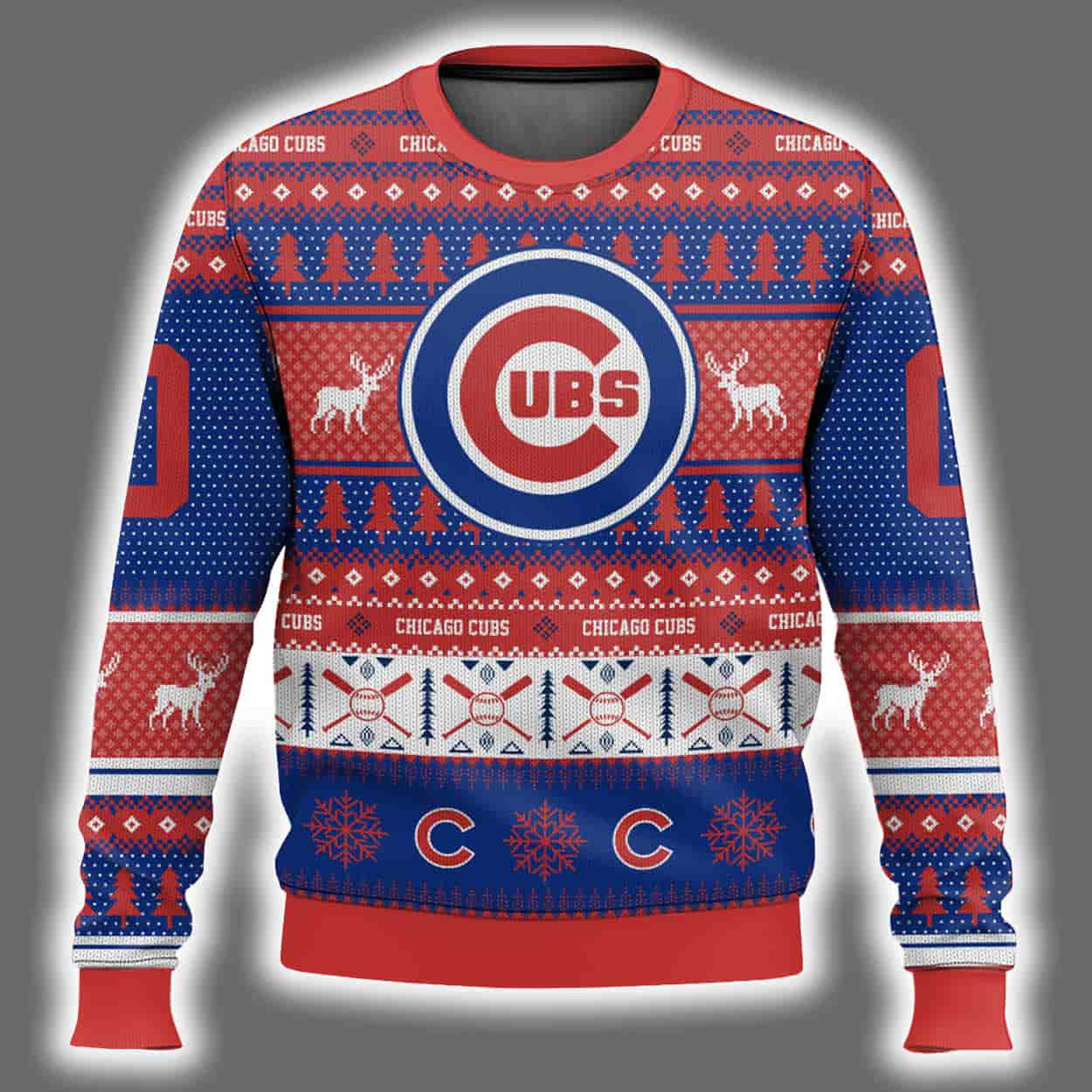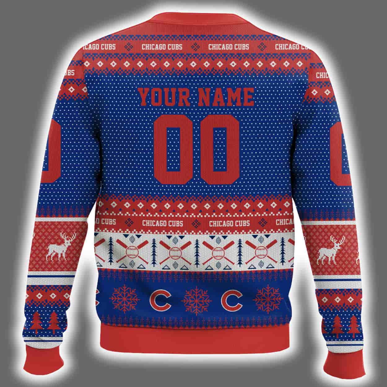 Get ready to jingle all the way to Wrigley Field—or your next holiday party—with this sweater! This eye-catching piece blends the classic charm of holiday knitwear with the unmistakable swagger of Chicago Cubs fandom. Drenched in team colors—red, blue, and white—it features a bold Cubs logo front and center, surrounded by snowflakes, reindeer, and baseball-themed patterns. The sleeves and back carry the number “00” and a customizable nameplate, making it uniquely yours. Whether you’re sipping cocoa or cheering from the couch, this sweater is a home run for holiday style.
