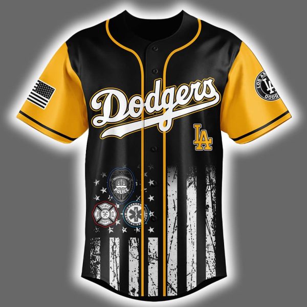 Swing into action with the 2025 Dodgers First Responders Night Jersey, a standout piece for Los Angeles Dodgers fans who want to honor heroes while cheering their team. This sharp black jersey features the iconic “Dodgers” script in white across the chest, accented with vibrant yellow piping that lights up like a Hollywood spotlight. The front showcases a distressed American flag with a weathered stripe effect, symbolizing resilience and grit. Turn it around, and you’ll see “FIRST RESPONDER” emblazoned above a striking Los Angeles Fire Department emblem, featuring an eagle, crossed axes, and an EKG line—proof these heroes keep the city’s heartbeat strong. The sleeves sport American flag patches and a classic Dodgers “LA” logo, blending team pride with patriotic flair.
