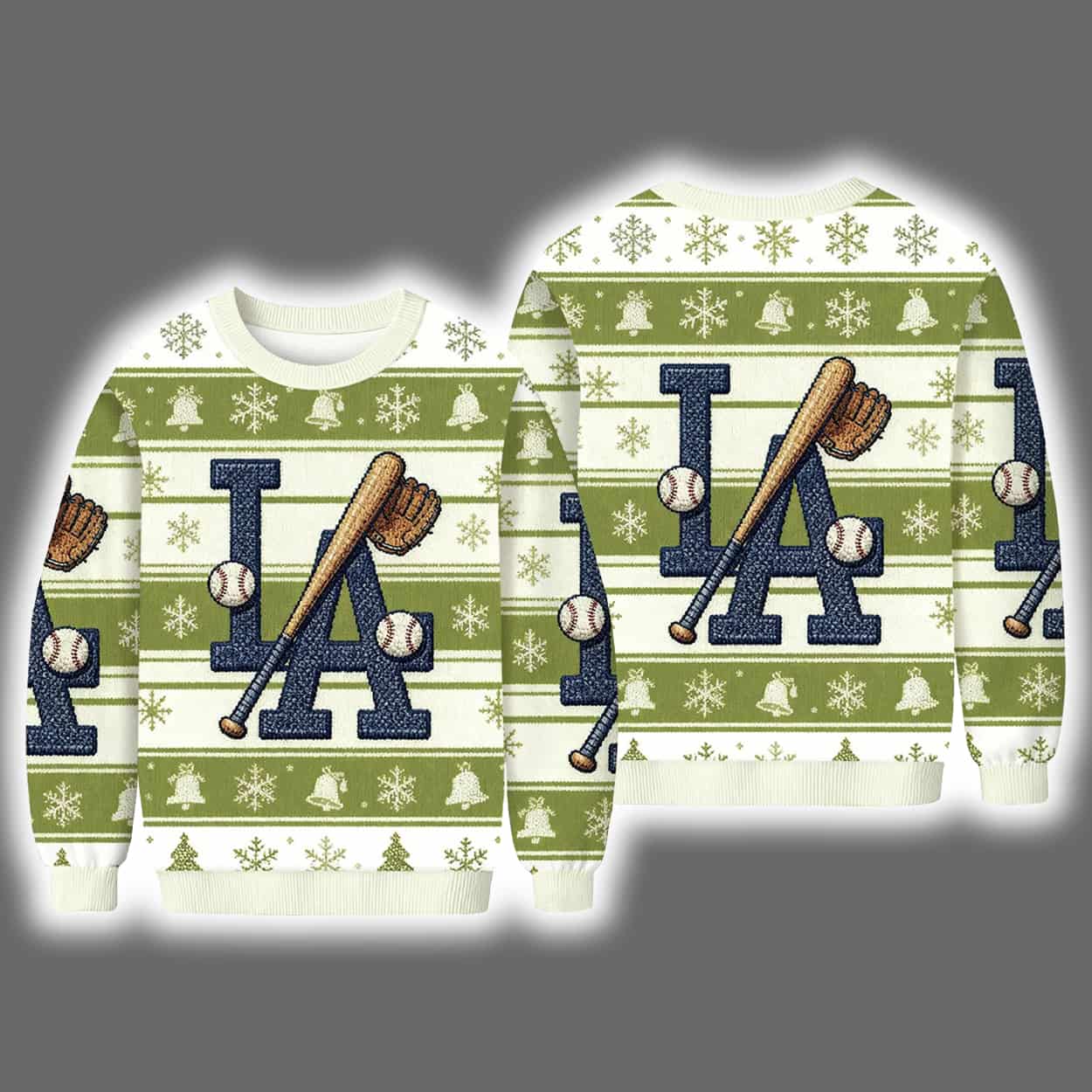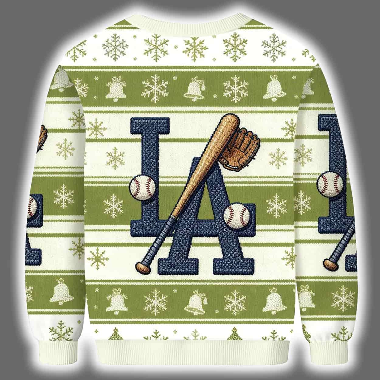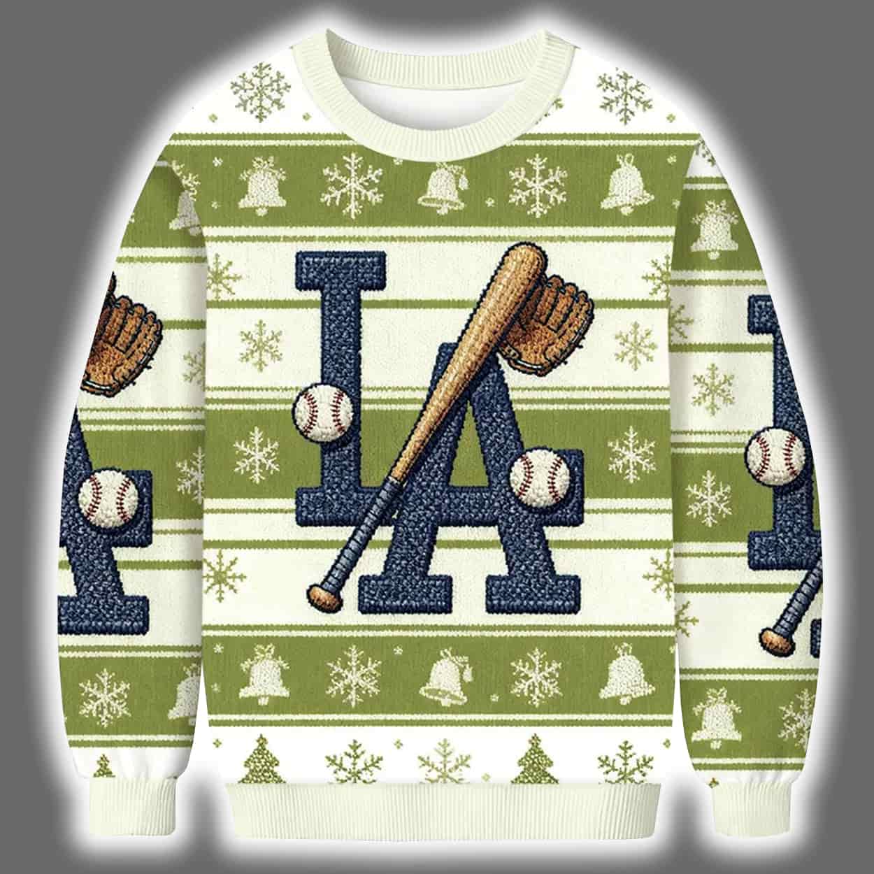 Deck the halls and the dugout with the ultimate fan gear for the festive season! This sweater is a merry mashup of holiday spirit and baseball bravado. Dominated by a bold navy “LA” front and center, the design is playfully interrupted by a crossed baseball bat. Two baseballs add extra flair, while the backdrop bursts with green and white stripes, snowflakes, bells, and other jolly icons that wrap the sweater in pure holiday magic.