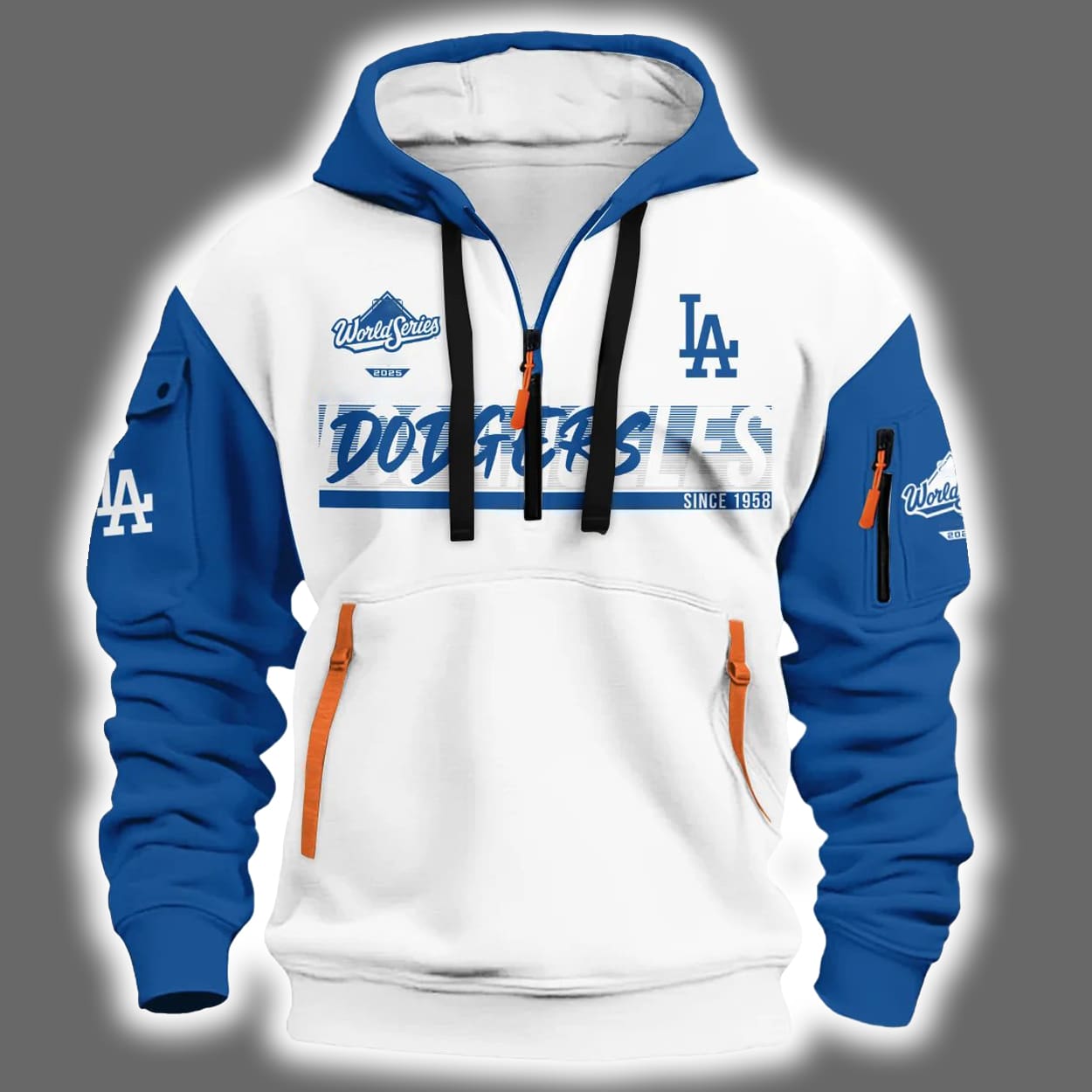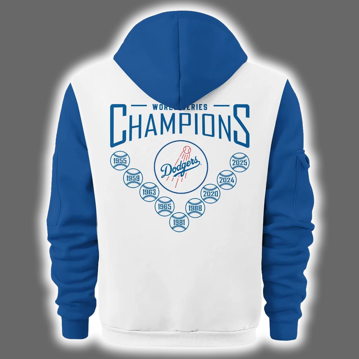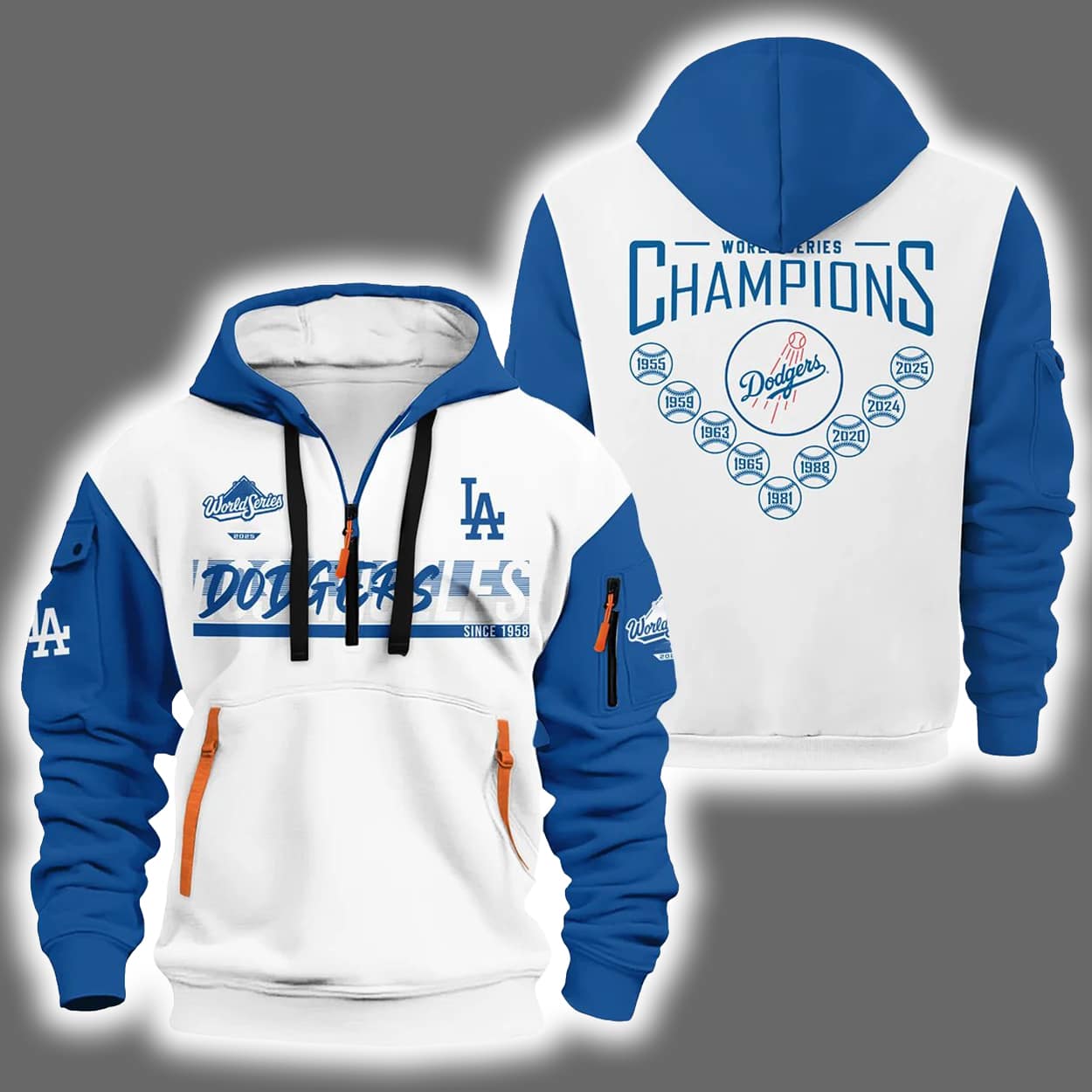Step into the spotlight with this hoodie—a dynamic fusion of team pride and street-ready swagger. This hoodie features a crisp white body contrasted by electric blue sleeves and hood, accented with a bold orange half zipper that adds a punch of personality. On the front, the iconic “Dodgers” script and “LA” logo make a confident statement, while the back turns heads with “World Series Champions” emblazoned above a lineup of baseball icons marking the team’s legendary victories: 1955, 1959, 1963, 1965, 1981, 1988, 2020, 2024 and 2025. It’s not just a hoodie—it’s a walking scoreboard of greatness.