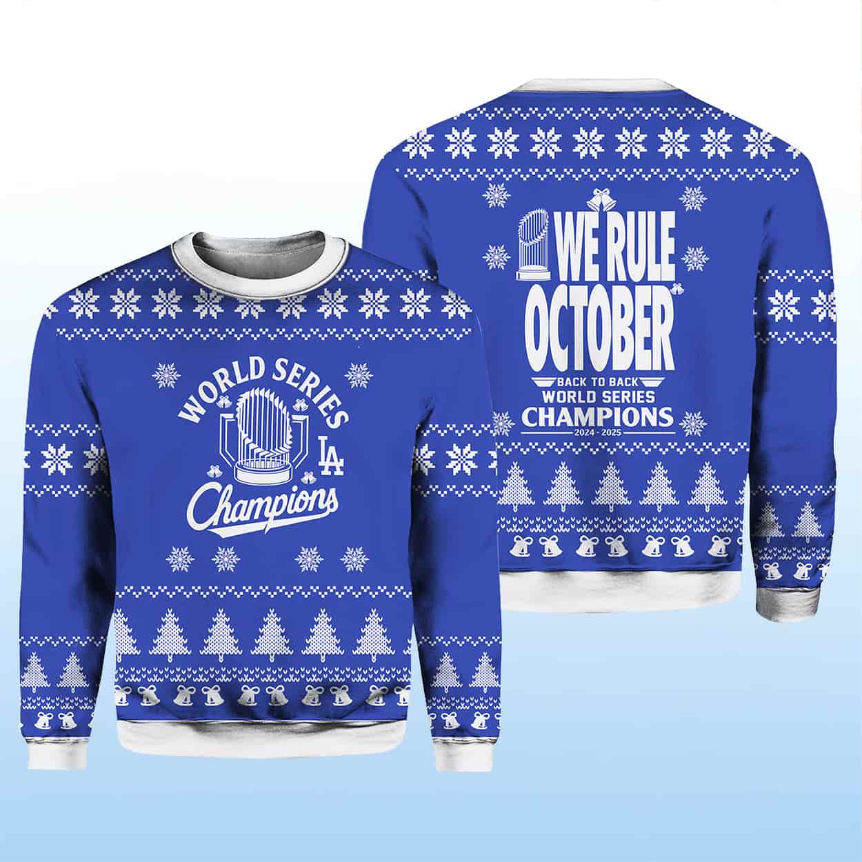 Ready to rule the holidays like the Dodgers rule October? Grab your 2025 Dodgers World Series We Rule October Back To Back Ugly Sweater now and wear your back-to-back pride with every jingle and cheer!
