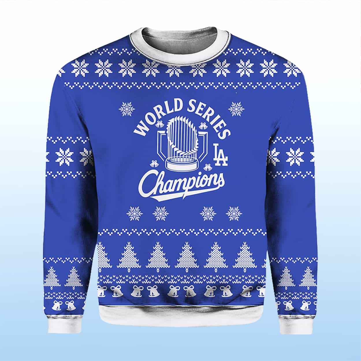 This sweater is a festive tribute to baseball dominance and holiday joy. Bathed in bold Dodger blue, this sweater features the triumphant “WORLD SERIES Champions” text across the front, paired with the iconic “LA” logo and a baseball graphic that screams victory. The back ups the swagger with “WE RULE OCTOBER” and “BACK TO BACK WORLD SERIES CHAMPIONS” emblazoned above a cheeky tombstone graphic—because the competition is officially buried. Snowflakes, Christmas trees, and playful patterns wrap the design in seasonal charm, making it a must-have for fans who love to win and celebrate in style.