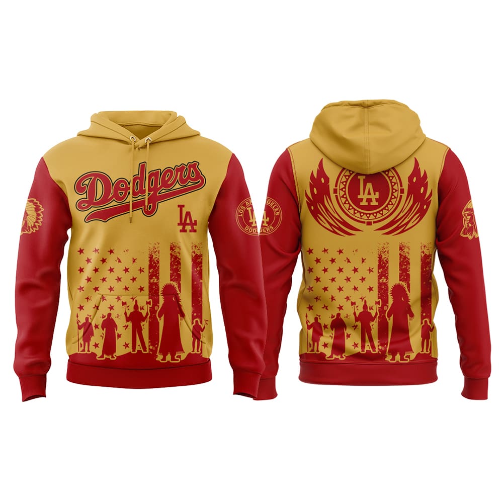 This design is more than just apparel—it’s a tribute! Inspired by Native American Heritage Month, the hoodie’s back tells a story: the silhouettes represent unity and strength, blending seamlessly with the Dodgers’ bold identity. The fiery LA logo adds a playful yet powerful touch, symbolizing the city’s vibrant spirit. Created for those who dare to think differently, this piece merges sports fandom with cultural respect, making it a conversation starter. Whether you’re cheering at Dodger Stadium or strolling downtown, this set lets you wear your pride with purpose.