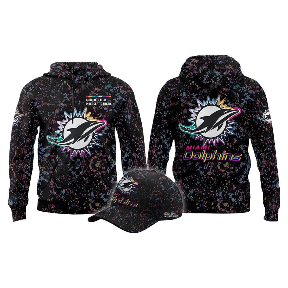 Step into the spotlight with the 2025 Dolphins Crucial Catch Intercept Cancer Hoodie Cap—a dynamic duo that fuses team pride with fearless fashion. The black base sets the stage for a riot of color, with a splattered paint design that looks like the Dolphins just scored a touchdown in an art studio. The hoodie proudly displays the Dolphins logo—a sleek dolphin leaping in front of a sunburst—while one version adds the bold “DOLPHINS” text in a multicolored font that pops like confetti. The matching cap completes the look, echoing the same energetic paint splash and logo front and center.