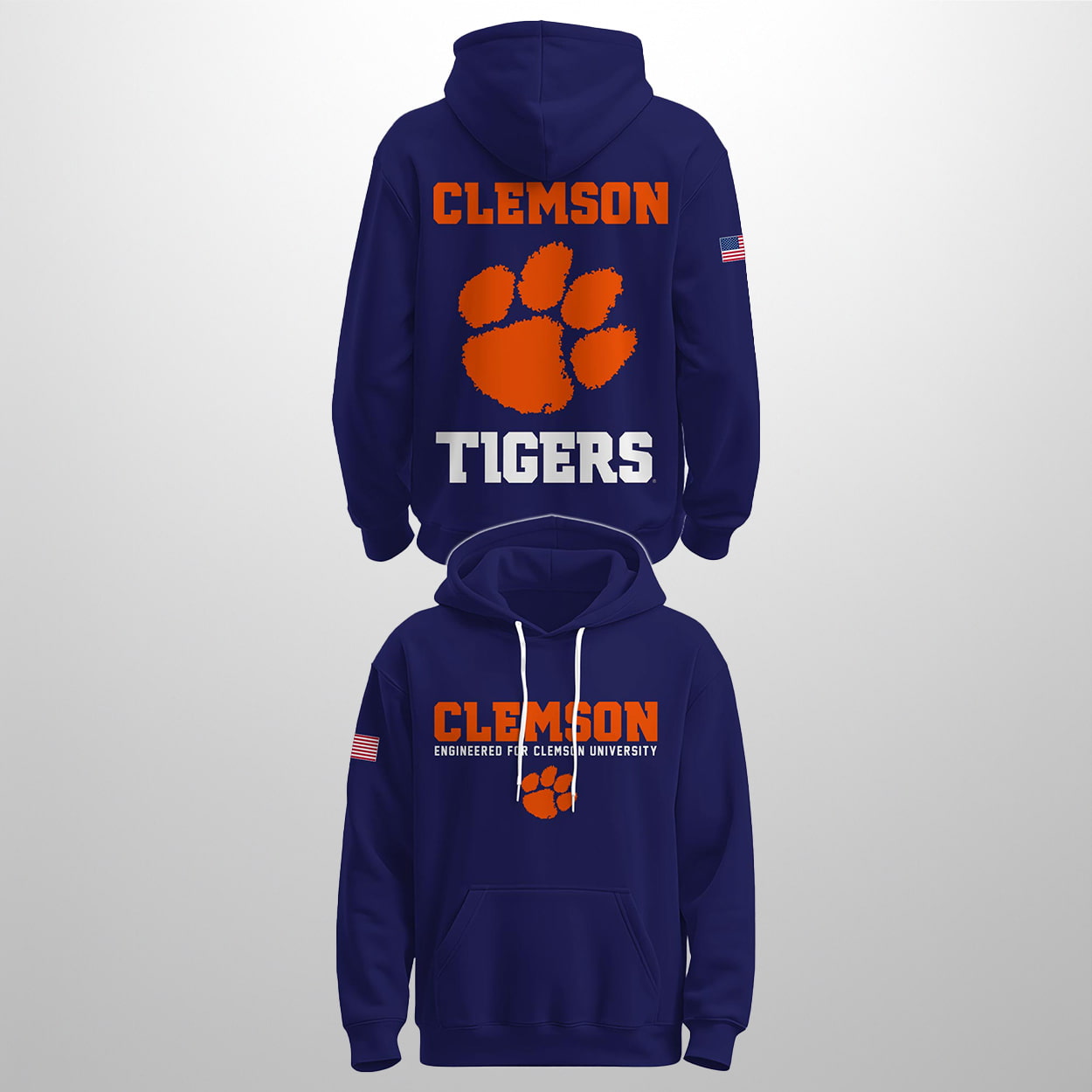This hoodie is not just a layer—it’s a legacy. Cloaked in deep navy blue, this hoodie makes a statement from both the front and the back. On the chest, “CLEMSON” blazes in orange above a fierce tiger paw, with “UNIVERSITY OF SOUTH CAROLINA” stamped below in crisp white. Flip it around and the energy doubles: a jumbo orange paw print dominates the back, sandwiched between “CLEMSON” in bold orange and “TIGERS” in white block letters. And don’t miss the American flag patch on the sleeve—it’s a salute to pride, unity, and bold ambition.