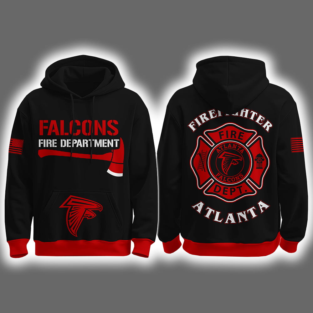 Light up game night with the 2025 Falcons Firefighter Appreciation Night Game Hoodie Joggers Cap—a set that’s as bold as the heroes it celebrates. The hoodie leads the charge with “FALCONS FIRE DEPARTMENT” blazing across the chest in red and white, anchored by a fire axe graphic and a fierce red falcon logo near the hem. Spin it around and you’ll find “FIREFIGHTER ATLANTA” circling a powerful fire department emblem, complete with helmet, tools, and grit. The sleeve rocks an American flag patch, because this look is all about pride—from the station to the stadium.