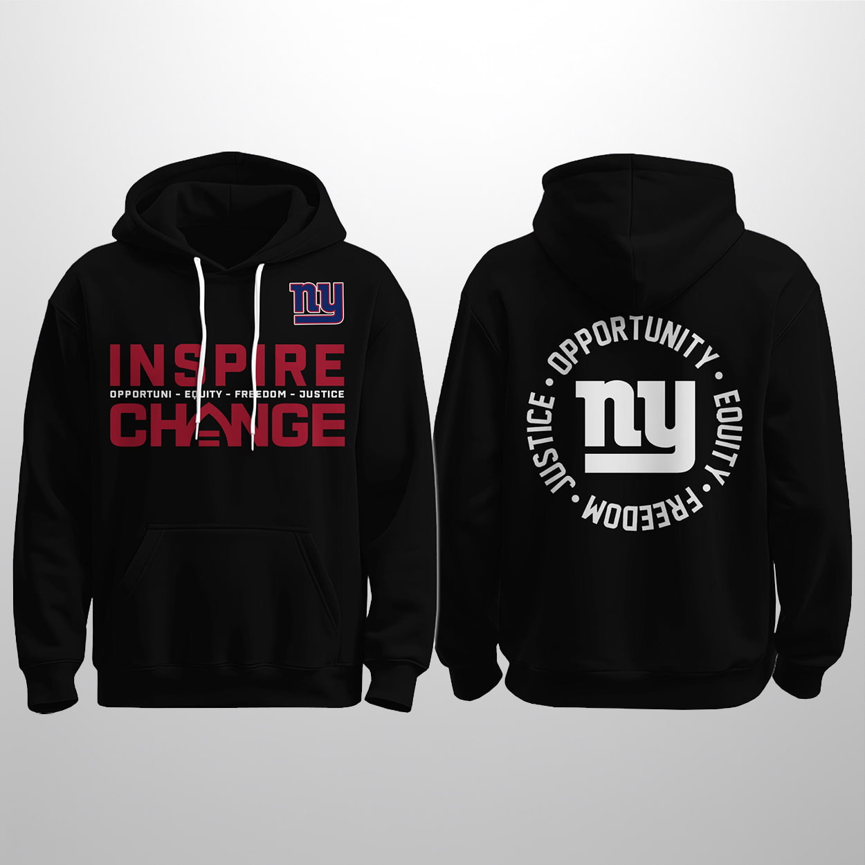 This hoodie doesn’t whisper — it shouts. On the front, the Giants logo sits confidently on the upper left chest, just above a bold declaration: “INSPIRE CHANGE.” Below that, four powerful words line up like a championship roster: “OPPORTUNITY • EQUITY • FREEDOM • JUSTICE.” Turn it around and the back delivers a visual mic drop — the Giants logo encircled by the same four values, forming a striking halo of purpose. It’s sleek, it’s spirited, and it’s ready to make a statement from the subway to the stadium.
