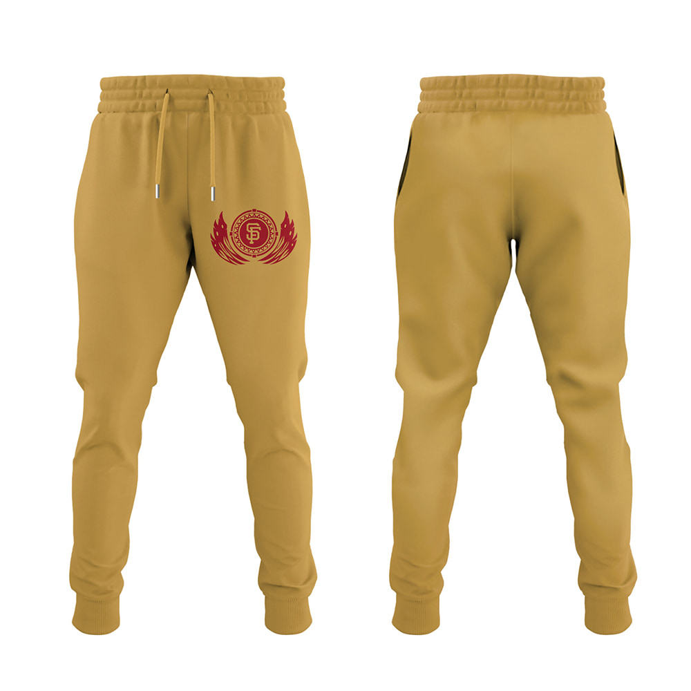 Step into the 2025 season with the 2025 Giants x Native American Heritage Month Hoodie Joggers Cap, a collection that blends team pride with cultural reverence. The hoodie steals the show with its mustard-yellow top and deep-red sleeves, proudly displaying “GIANTS” across the chest in fiery red letters, paired with the iconic “SF” logo. Silhouettes of Native American figures dance across the front and back, framed by stars that sparkle with pride. The back features a larger “SF” emblem, encircled by dynamic red flames, symbolizing strength and unity. This set is perfect for game days or casual outings.