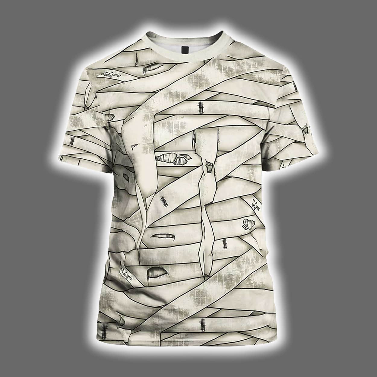 Step into the eerie spotlight this Halloween with this tee—a wearable illusion that transforms you into a walking relic of ancient horror. This shirt features a full-body print of chaotic, overlapping beige and off-white strips, mimicking the look of unraveling bandages. Black outlines and shadowing add depth and drama, making the design pop with a effect that wraps around the front, back, and sleeves. Whether you’re hitting a costume party or just haunting the streets, this tee delivers a bold, effortless look that screams undead chic.