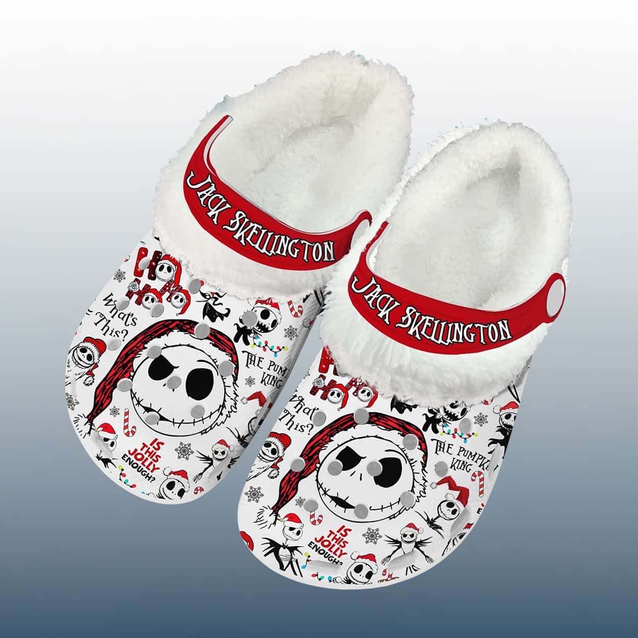 Celebrate the season with a twist of fright in this crocs. These festive clogs feature a bold white base adorned with Jack Skellington’s iconic grinning face, each topped with a Santa hat for that eerie-yet-jolly vibe. The red strap pops with “JACK SKELLINGTON” in crisp white lettering, while playful phrases like “IS THIS JOLLY ENOUGH?” and “THE PUMPKIN KING” add a cheeky nod to Tim Burton’s beloved classic. Snowflakes and skulls dance across the design, blending spooky charm with winter whimsy. Inside, a plush fleece lining promises warmth and comfort for every haunting step.