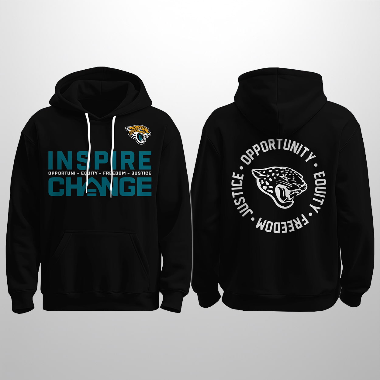 Get ready to pounce into the season with a hoodie that speaks louder than the scoreboard. This hoodie blends Jaguars swagger with a message that matters. On the front, the Jaguars logo sits proudly on the chest, just above the bold blue proclamation: “INSPIRE CHANGE.” Beneath that, four words—“OPPORTUNITY • EQUITY • FREEDOM • JUSTICE”—line up like a defensive front for progress. Spin it around and you’ll find the Jaguars logo again, centered on the back and encircled by those same four values, forming a powerful emblem of purpose.