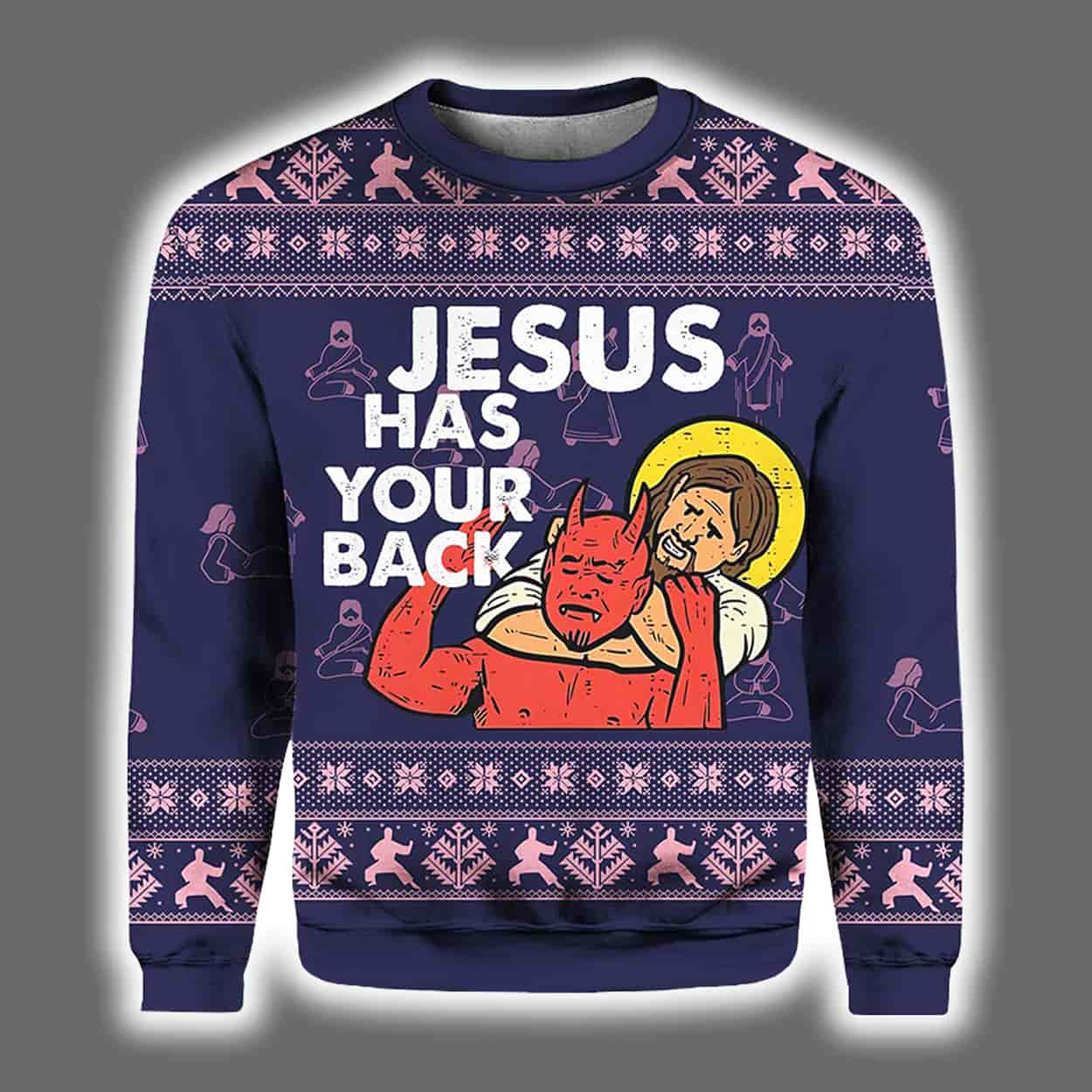 Make your holiday wardrobe unforgettable with this sweater. This festive favorite features a bold cartoon-style graphic of Jesus, halo aglow, standing protectively behind a bashful red devil. With one arm draped around the devil’s shoulders, the message is clear—and printed right across the chest: “JESUS HAS YOUR BACK.” The design repeats on both front and back, surrounded by classic holiday motifs like snowflakes, reindeer, and geometric patterns in pink and white against a deep blue canvas. It’s cozy, quirky, and guaranteed to be the talk of every Christmas party.