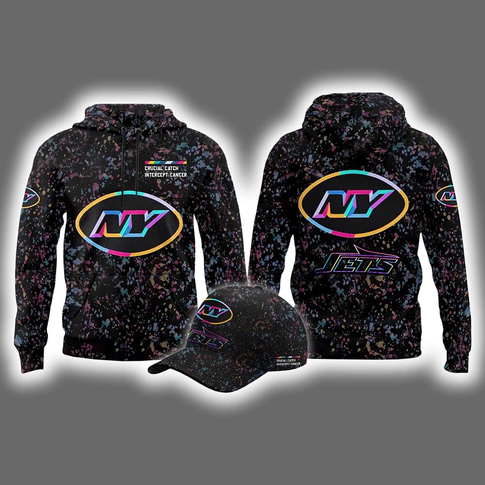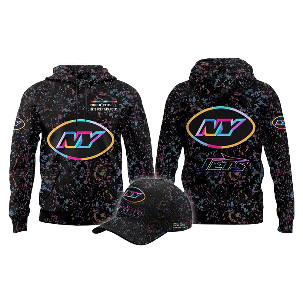 Turn heads and tackle cancer with flair in the 2025 Jets Crucial Catch Intercept Cancer Hoodie Cap. This eye-catching duo features a black base splashed with a kaleidoscope of pink, blue, and yellow—like a graffiti mural that shouts hope and hustle. The oversized oval “NY” logo bursts from the chest and cap front, outlined in electric hues that demand attention. Whether you’re tailgating or just turning your daily walk into a runway, this hoodie and cap combo is your ticket to standing out while standing up for a cause.