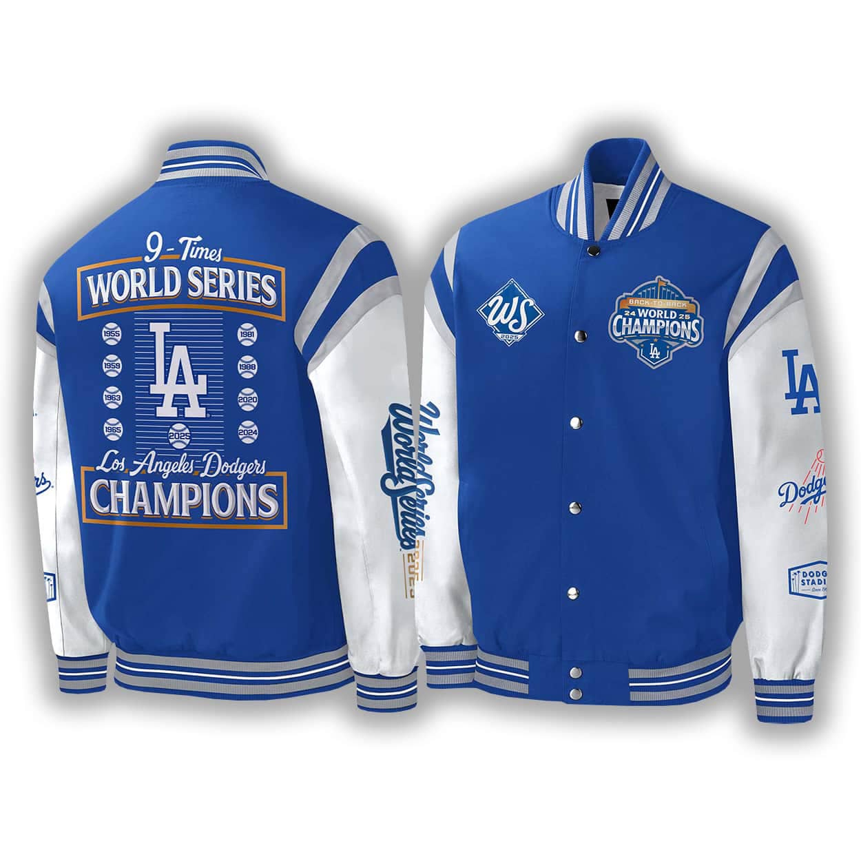 Make room in your wardrobe for greatness—this jacket is here to steal the spotlight. This blue-and-white stunner is decked out with championship energy, featuring “WORLD SERIES CHAMPIONS” patches on the chest and sleeves, the classic “LA” logo, and a bold “WS” emblem that screams baseball royalty. But the real magic is on the back: “9-Time WORLD SERIES CHAMPIONS” printed above the Dodgers logo, flanked by nine stars that mark each glorious title. It’s not just a jacket—it’s a walking scoreboard of dominance.